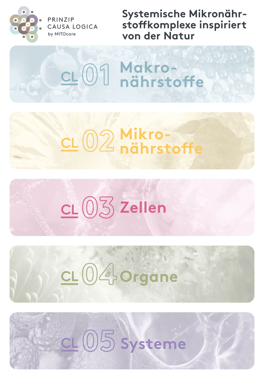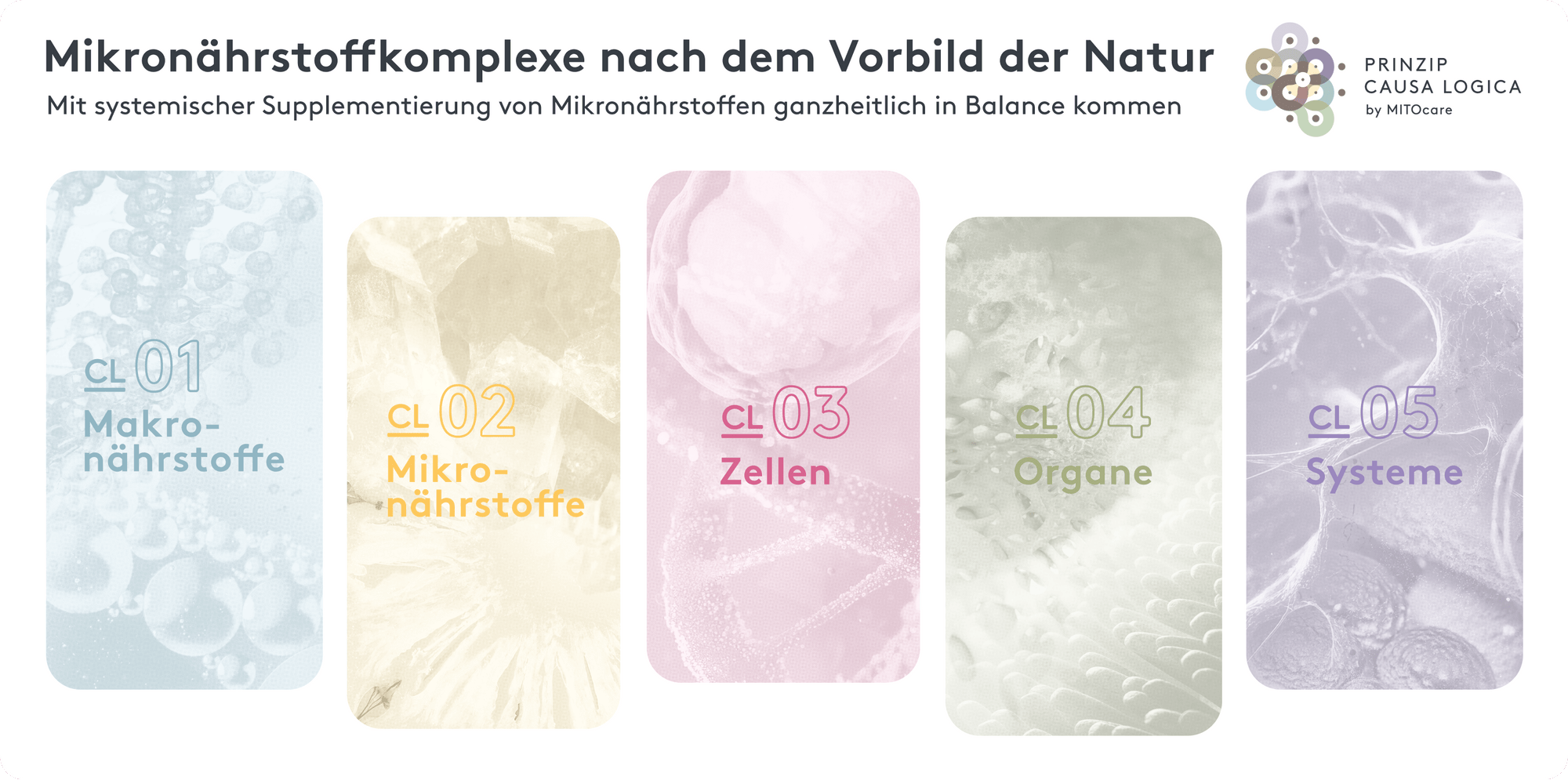 Soluciones de micronutrientes basadas en el principio Causa Lógica: Nuestros suplementos de micronutrientes se basan en un sistema que hemos desarrollado continuamente desde 2013 junto con médicos y expertos. Combina los últimos descubrimientos científicos, la experiencia clínica y el principio de sinergia de la naturaleza. El objetivo es prevenir el exceso y la falta de nutrientes y promover el equilibrio holístico en todo el cuerpo. Fabricados en la región DACH, nuestros suplementos se caracterizan por su máxima pureza, materias primas de primera calidad, máxima biodisponibilidad y fórmulas perfectamente equilibradas.