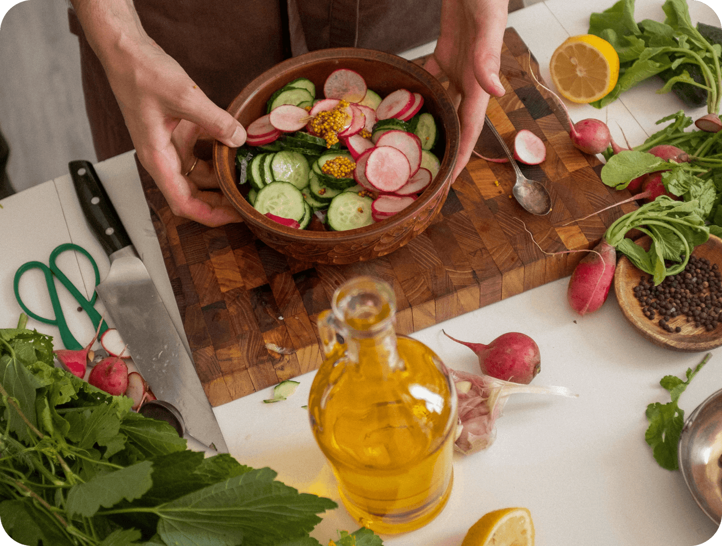 • Mittags – Nährstoff-Booster: Ein Salat zum Lunch? Olivenöl verbessert die Aufnahme fettlöslicher Vitamine und liefert Polyphenole.¹ Raffiniertes Rapsöl eignet sich ideal zum schonenden Braten; Lein- oder Hanföl passen hervorragend in grüne Smoothies (nicht erhitzen).¹