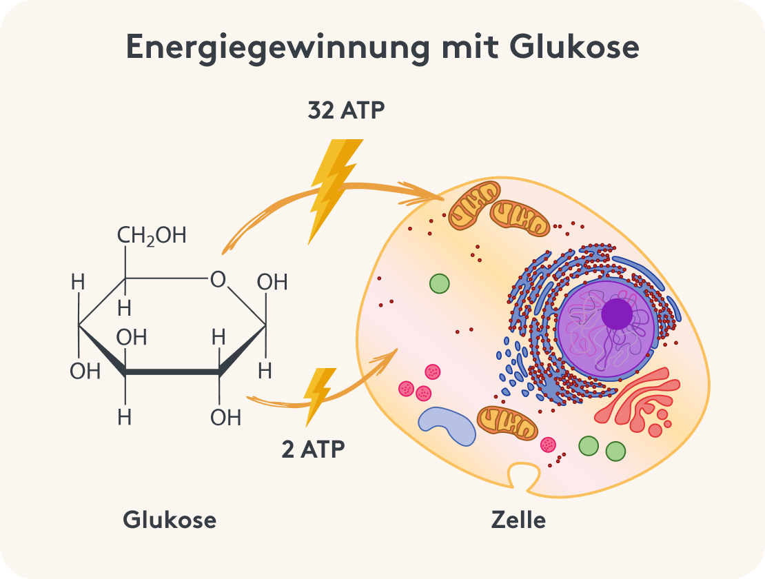 Der Körper benötigt ständig Energie. Um sie freizusetzen, nutzt er Glukose als Treibstoff. Auch Gehirn und Nerven lieben Zucker: Allein das Hirn verbrennt im Schnitt 142 Gramm Glukose am Tag, das entspricht rund 14 Esslöffeln Zucker. Die Muskeln benötigen ebenfalls schnelle Energie in Form von Glukose. Ihr Vorteil gegenüber Fettsäuren: Sie kann über zwei verschiedene Wege als Energieträger genutzt werden, und zwar durch Verbrennung und Vergärung. Die Vergärung ist vor allem beim Sport vorteilhaft.