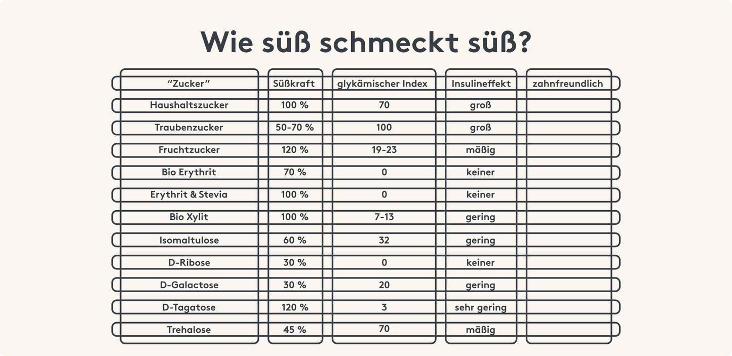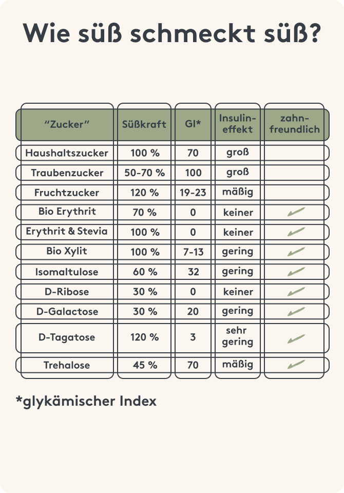 Was du bei Süßstoffen beachten solltest, welche Mengen an Süßstoffen oder Fruktose gut für dich sind und was es mit funktionellen Zuckern auf sich hat, erfährst du in unserem Artikel zum Thema Zuckeralternativen.