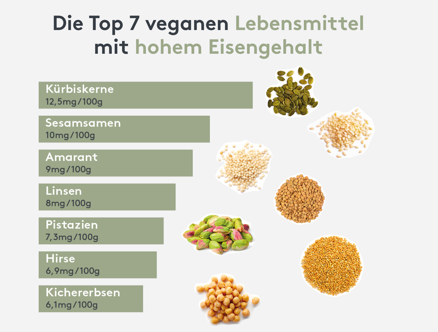 Ist deine Ernährung vegetarisch oder vegan, helfen dir Lebensmittel wie Samen, Kerne oder Hülsenfrüchte dabei, genug Eisen zu dir zu nehmen und deinen Eisenbedarf zu decken.