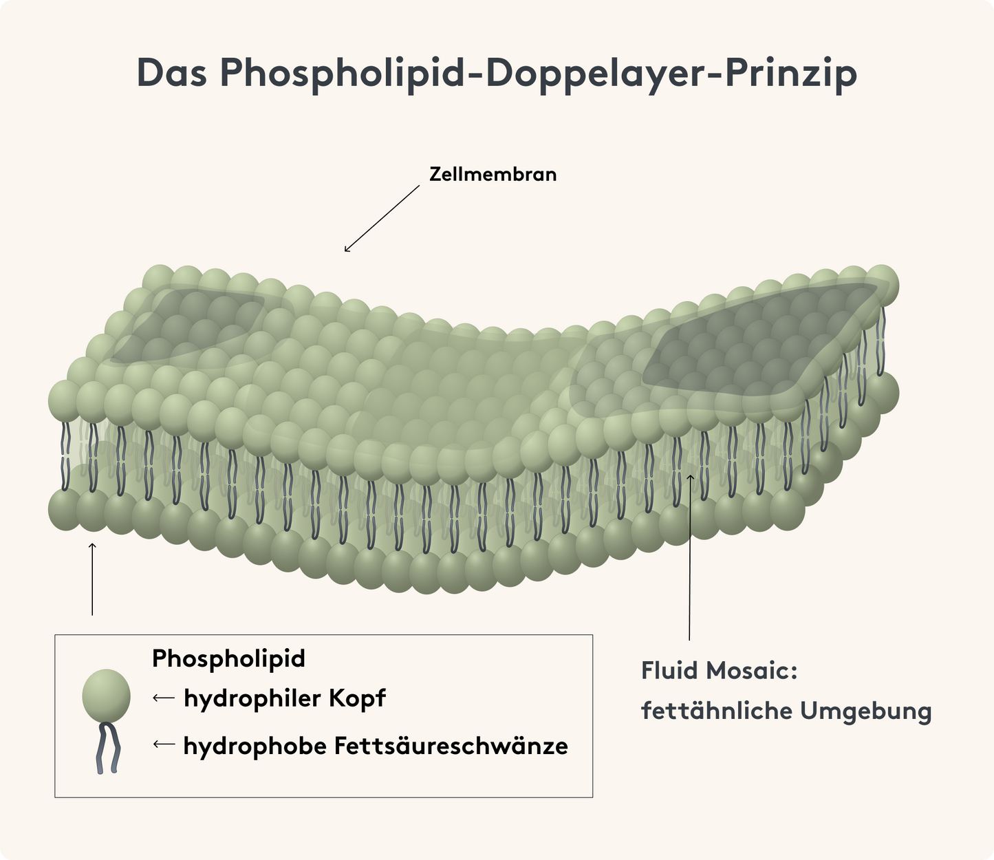 Phospholipide sind amphiphil: Der wasserlösliche Kopf interagiert mit Blut- oder Zellflüssigkeit, die fettlöslichen Schwänze halten das Bilayer zusammen. Durch diese Doppelnatur können Phospholipide sowohl wasser- als auch fettlösliche Moleküle „managen“ ⁴.