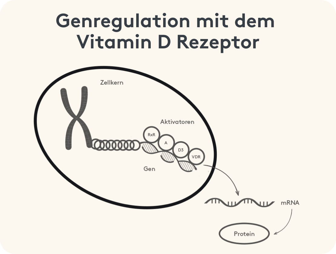 Der Vitamin D Rezeptor ist ein Protein, an das Vitamin D in der Zelle bindet. Nur mit diesem Rezeptor kann Vitamin D seine Wirkung auf deine Gene haben und damit obige Effekte verursachen6. Fehlt dieser Rezeptor, kommt es zu Problemen im Vitamin D Stoffwechsel, da ungebundenes, aktives Vitamin D in deiner Zelle sogar negative Auswirkungen haben kann, indem die Produktion von dem Vitamin D Rezeptor weiter gehemmt wird und Entzündungen gefördert werden7.
