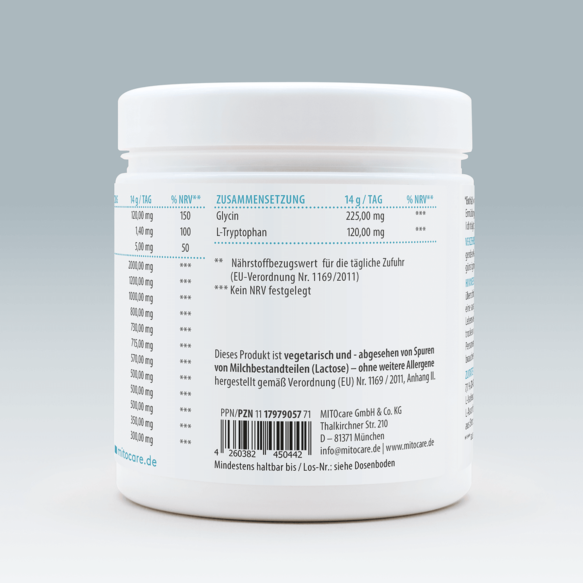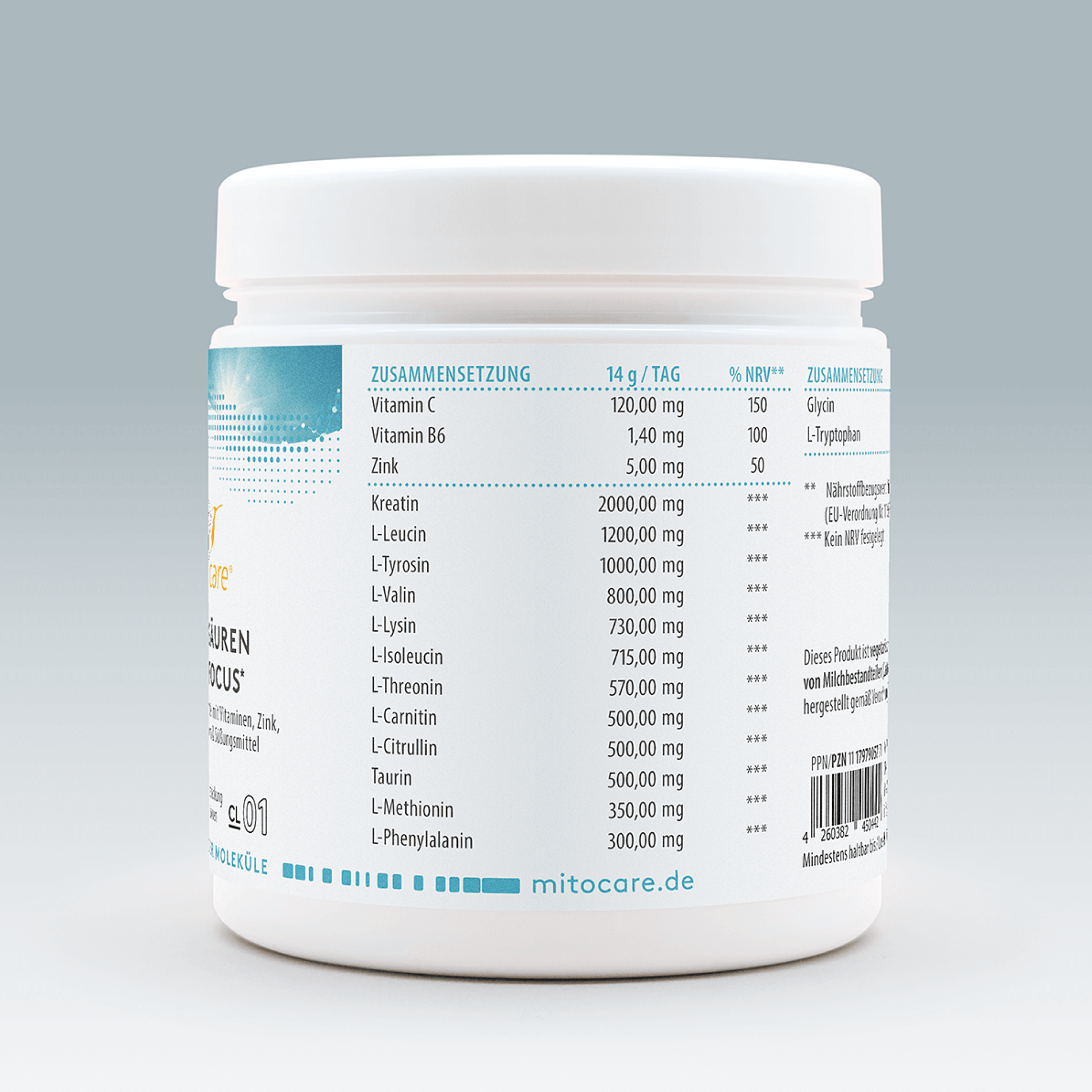 Unser MITOcare Aminosäuren Day & Focus* liefert dir mit nur einem Messlöffel täglich 12 hochwertige Aminosäuren zusammen mit Taurin und Kreatin, ergänzt durch Vitamin B6, Vitamin C, Zink sowie D-Galactose und D-Tagatose.