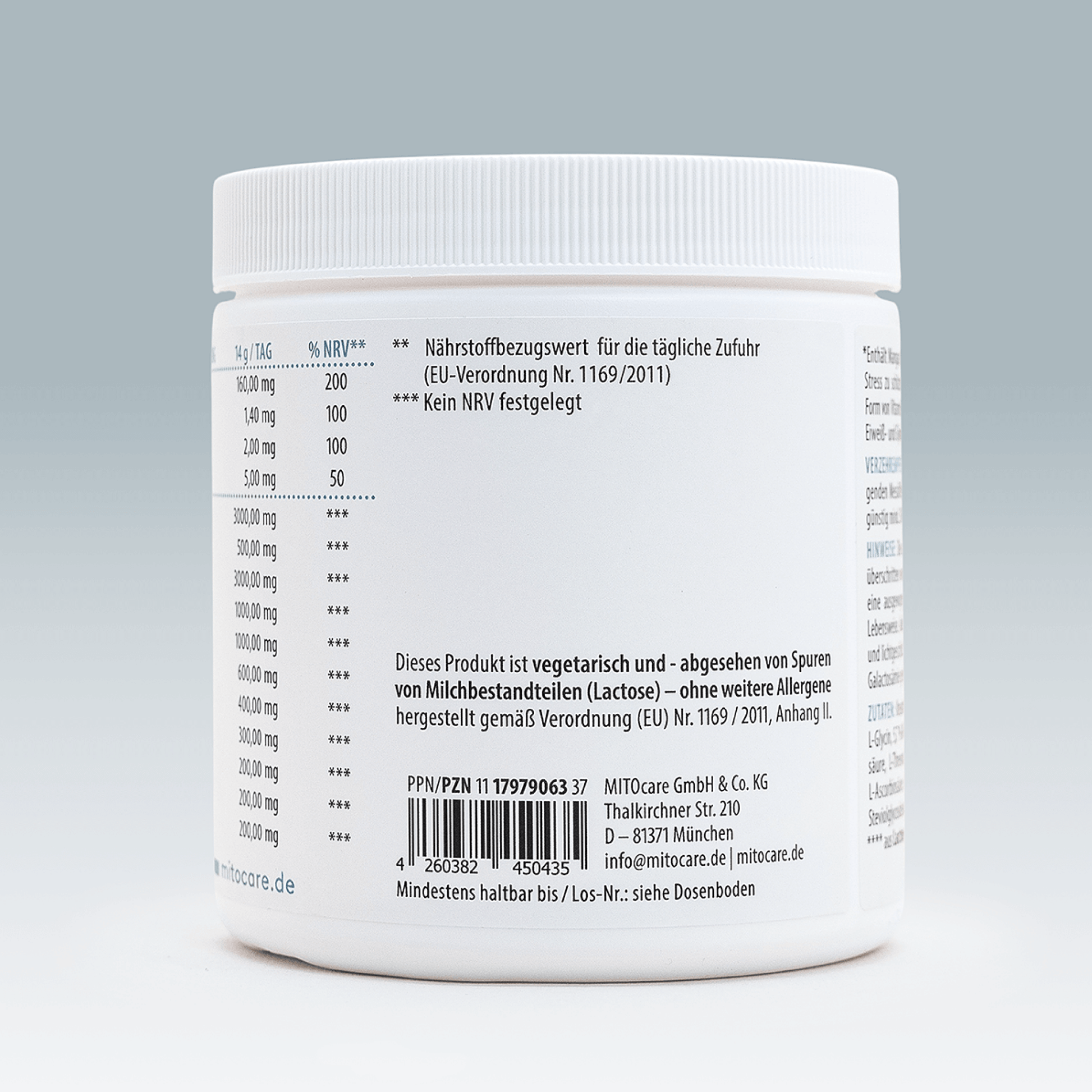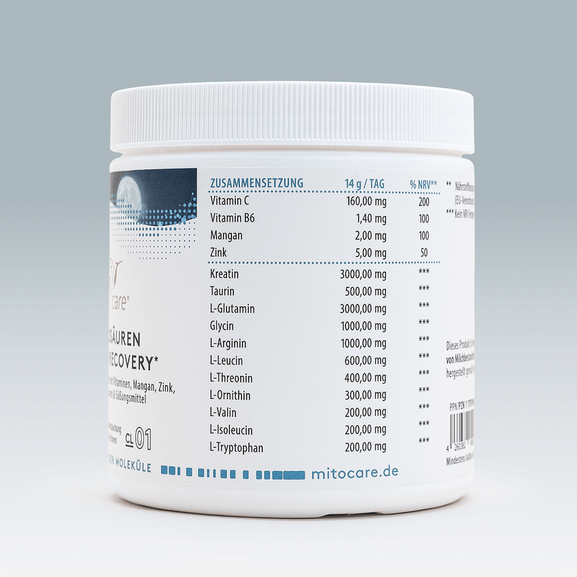 Das Produkt Aminosäuren Night & Recovery* ist eine ausgewogene Mischung aus 9 Aminosäuren, Taurin und Kreatin sowie Vitaminen, Mangan und Zink. Das enthaltene Vitamin C unterstützt den Zellschutz vor oxidativem Stress1,2 sowie die gesunde Kollagenbildung3 - auch im Schlaf. Vitamin B6 trägt zu einem intakten Eiweißstoffwechsel4 und zu einem ausgeglichenen Hormonhaushalt5 bei. Zudem leistet Zink einen Beitrag zu einem gesunden Kohlenhydrat6-, Fettsäure7- und Säure-Basen-Stoffwechsel8 sowie zur normalen DNA-Synthese9.