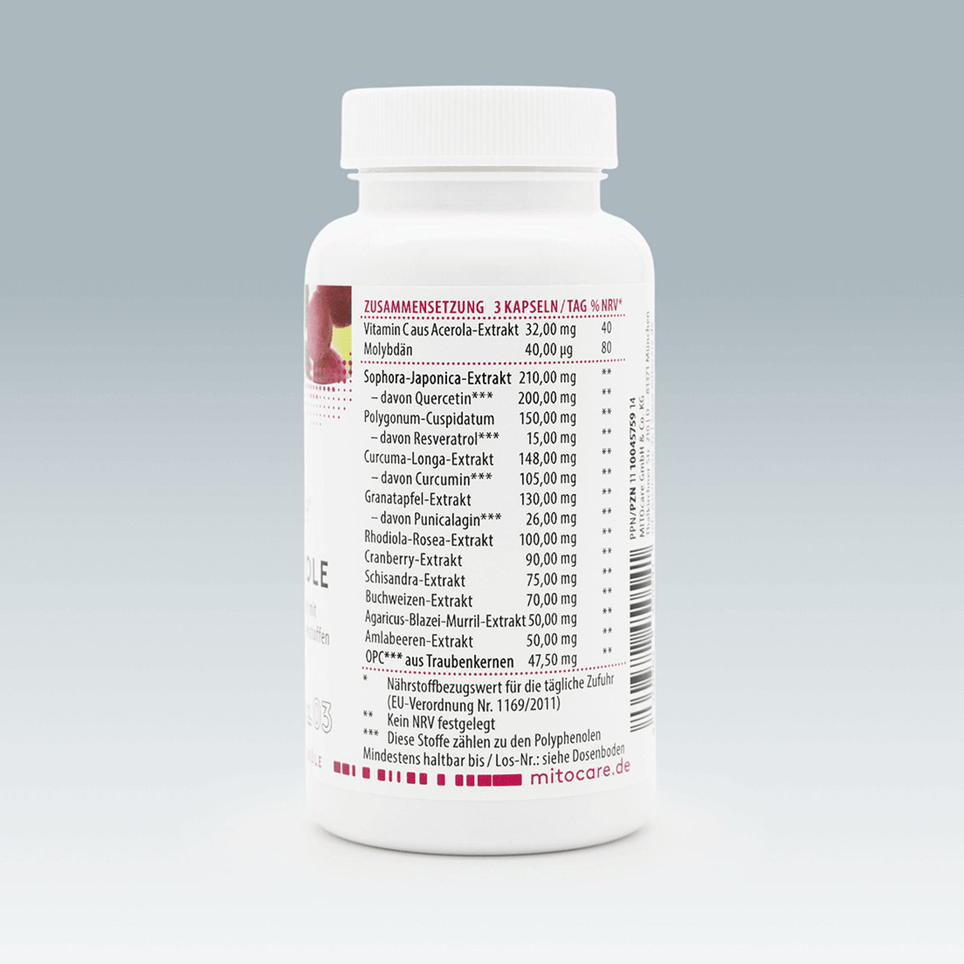 Zutaten: Pullulan (Kapselhülle, Gr.0), Sophora-Japonica-Extrakt, vitamin-c-reicher Acerola-Extrakt, Polygonum-Cuspidatum-Extrakt, Curcuma-Longa-Extrakt, Granatapfel-Extrakt, Rhodiola-Rosea-Extrakt, Cranberry-Extrakt, Schisandra-Extrakt, Buchweizen-Extrakt, Agaricus-Blazei-Murrill-Extrakt, Amlabeeren-Extrakt, Traubenkern-Extrakt, Natriummolybdat