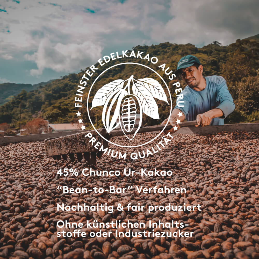 Durch die Verarbeitung im Bean-to-Bar-Verfahren, einem durchgängigen Produktionsprozess, bei dem alle Schritte von der Kakaobohne bis zur fertigen Tafel in einer Hand liegen, bleiben die natürlichen Aromen des Kakaos erhalten und ermöglichen ein besonders klares und intensives Geschmacksprofil. Die Kakaobohnen stammen aus kontrollierten Anbaugebieten in Peru und werden nach der Ernte fermentiert, schonend getrocknet und in kleinen Chargen weiterverarbeitet.