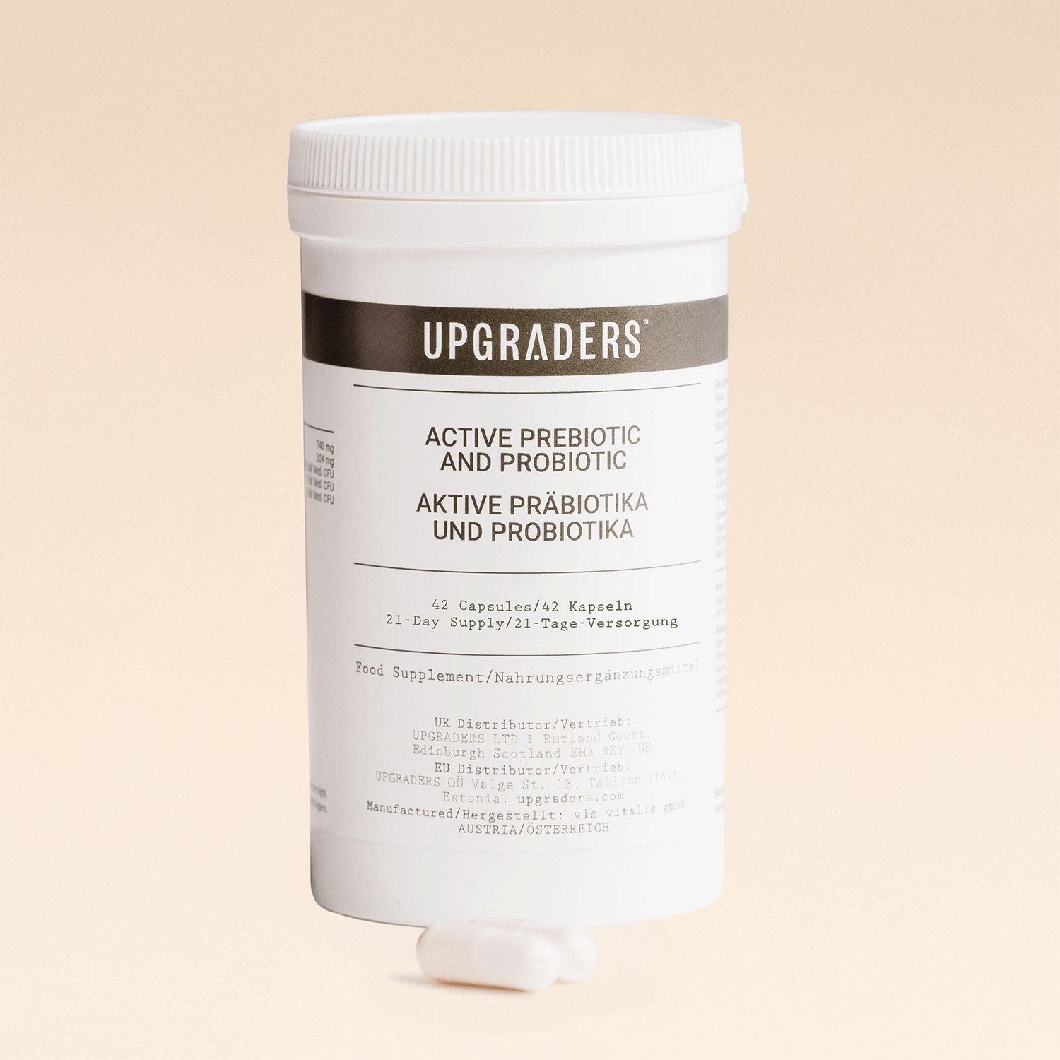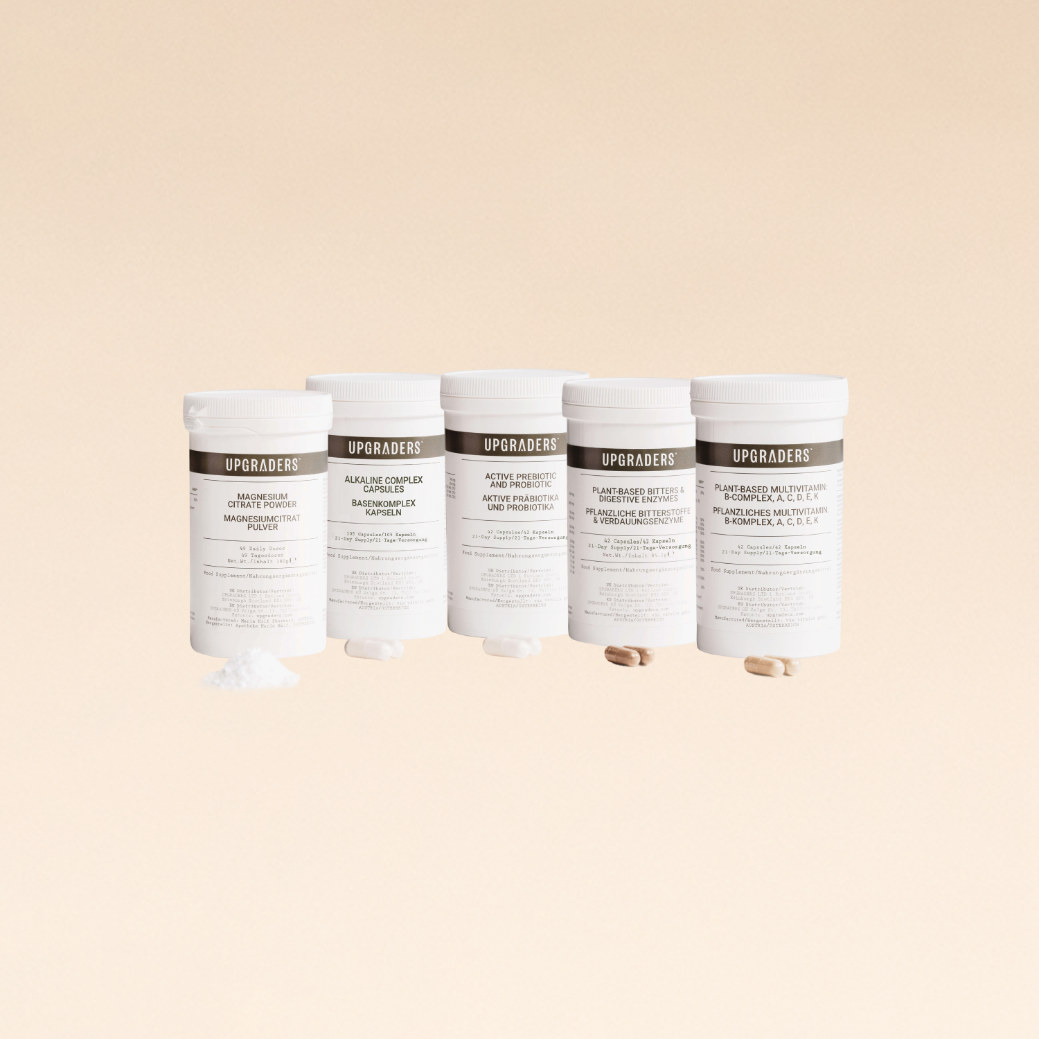 Das Upgraders® Kit stellt ein einzigartiges 21-tägiges Programm für zu Hause dar. 5 leistungsstarke, 100 % natürliche, synergistische Nahrungsergänzungsmittelmischungen, fachmännisch in den Alpen vom weltbekannten Mikrobiom-Experten Dr. Henning Sartor, PhD, hergestellt – entwickelt, um das Stoffwechselgleichgewicht wiederherzustellen und die Zellgesundheit zu revitalisieren.