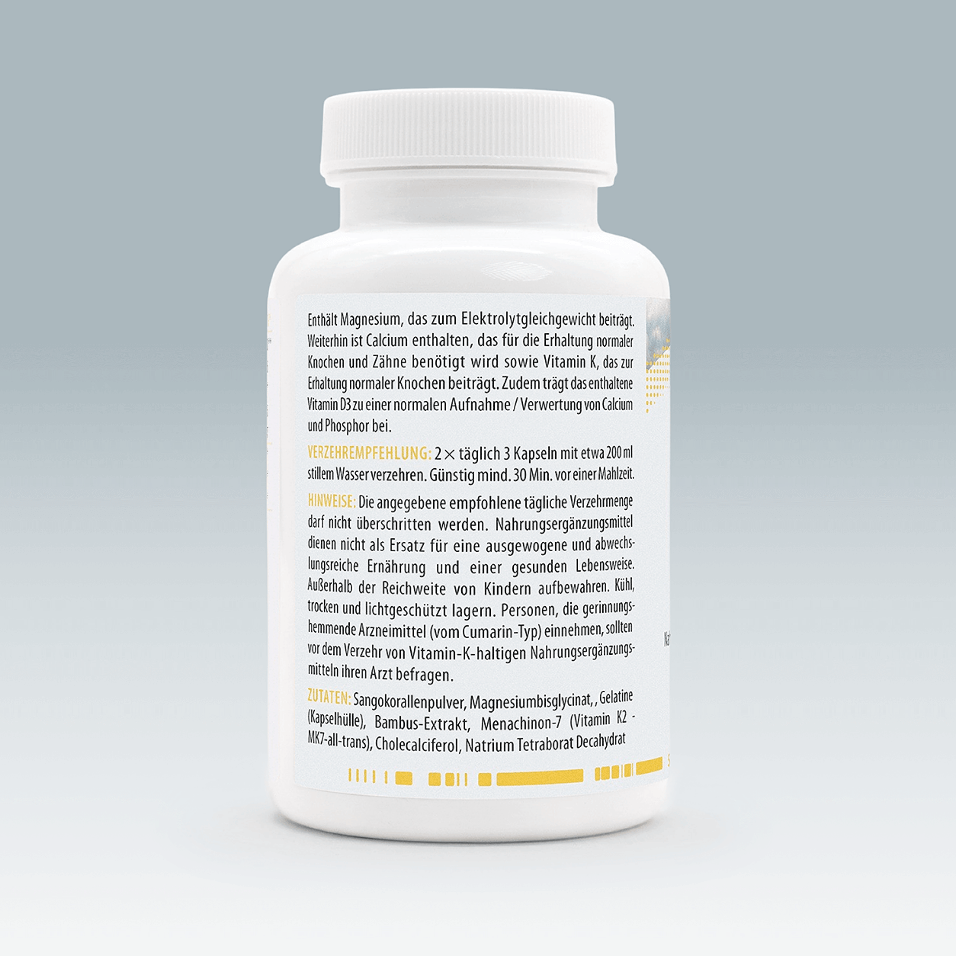 Zutaten: Sangokorallenpulver, Magnesiumbisglycinat, siliciumreicher Bambus-Extrakt, Gelatine (Kapselhülle aus Rind, Gr.0), Menachinon-7 (Vitamin K2 - MK7-all-trans), Cholecalciferol (Vitamin D3), Natrium Tetraborat Decahydrat