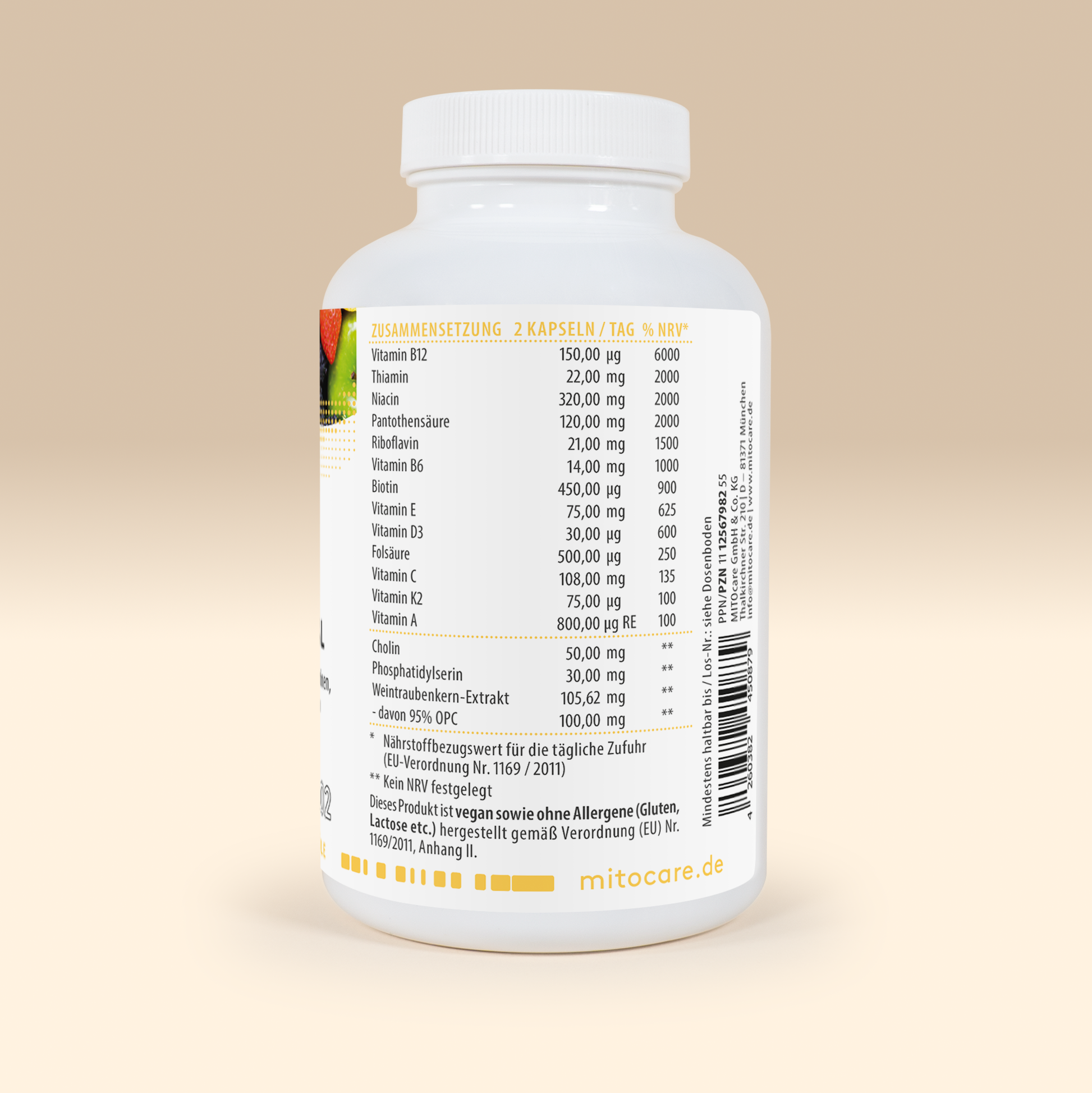 Zutaten: Nicotinamid (Vitamin B3), Pullulan (Kapselhülle Gr.00), vitamin-C-reicher Hagebutten-Extrakt, Phosphatidylserin, Calcium-D-Pantothenat, Cholinbitartrat, vitamin-C-reicher Acerola-Extrakt, OPC-reicher Weintraubenkern-Extrakt, Tocopherole -Tocotrienole (enthält Vitamin E), Retinylacetat (Vitamin A), Pyridoxal-5-Phosphat (Vitamin B6), Riboflavin-5-Phosphat (Vitamin B2), Thiaminhydrochlorid (Vitamin B1), Cholecalciferol (Vitamin D3), Menachinon (Vitamin K2 - MK7-all-trans), Calcium-L-Methylfolat, D-Biotin, Adenosylcobalamin, Hydroxocobalamin
