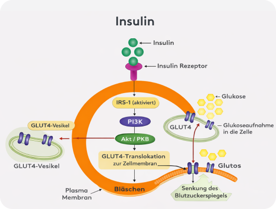 Insulin is a hormone produced by the pancreas that plays a central role in energy metabolism . It acts like a key: it binds to receptors on cell surfaces (such as in muscle or fat cells), thereby triggering a chain of signals. Once insulin docks onto the receptor, an insulin receptor substrate (IRS-1) is activated. This mediator then activates the enzyme PI3K (phosphoinositide 3-kinase) and subsequently the protein kinase Akt (PKB).¹ This cascade causes glucose transporters (GLUT4) to be moved to the cell surface, enabling the cell to take up glucose from the blood . Insulin thus ensures that sugar is transported from the blood into the cells and that blood glucose levels remain stable. If this signaling pathway functions smoothly, insulin transports glucose from the blood into the cells, thereby regulating blood glucose levels in the circulatory system. Insulin resistance occurs when cells in muscles, fat, and liver respond poorly to insulin and can no longer effectively absorb glucose from the blood. When this signaling pathway functions smoothly, blood sugar levels drop normally.