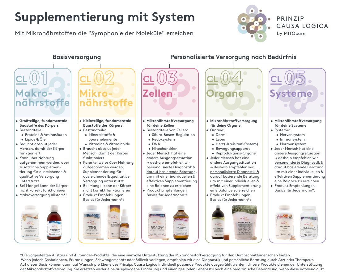 Auf dieser Basis entstehen bei MITOcare alle Komplexprodukte. Das Prinzip Causa Logica schafft Orientierung, fördert Verständnis und zeigt, wie systematische Supplementierung zu nachhaltiger Balance und ganzheitlicher Gesundheit führt.