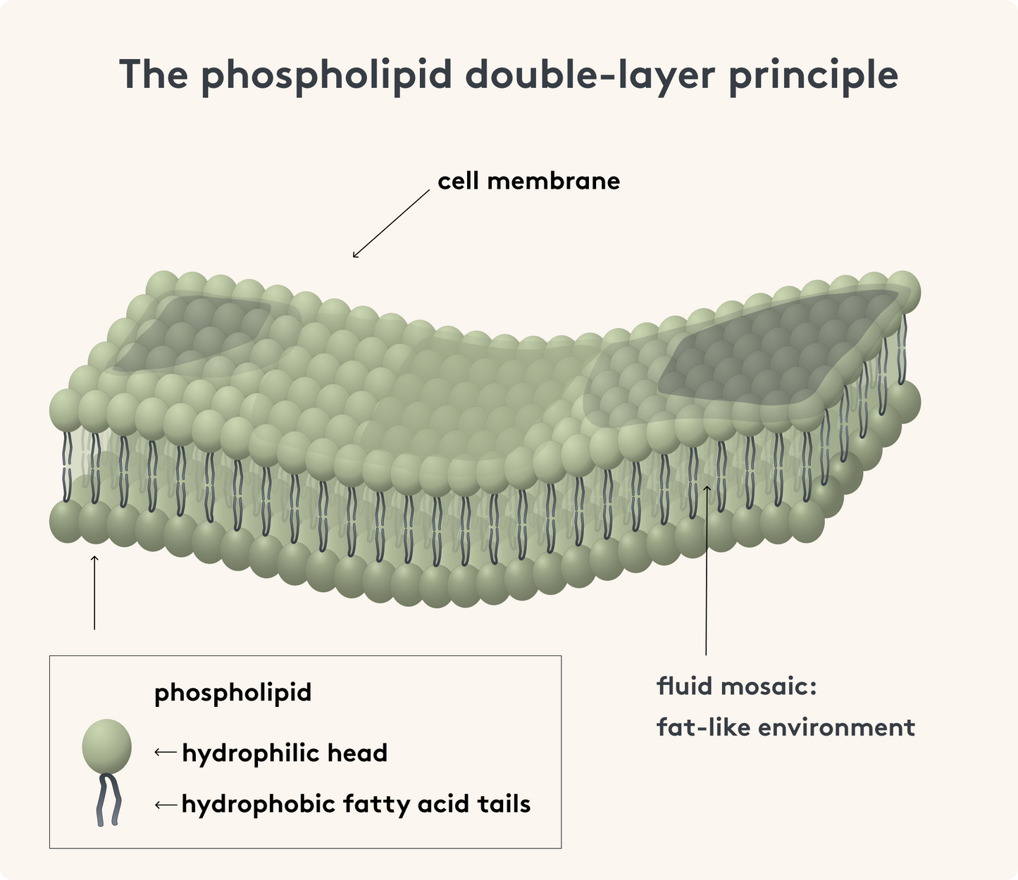 Phospholipids are amphiphilic : The water-soluble head interacts with blood or cellular fluid, while the fat-soluble tails hold the bilayer together. This dual nature allows phospholipids to "manage" both water- and fat-soluble molecules ⁴.