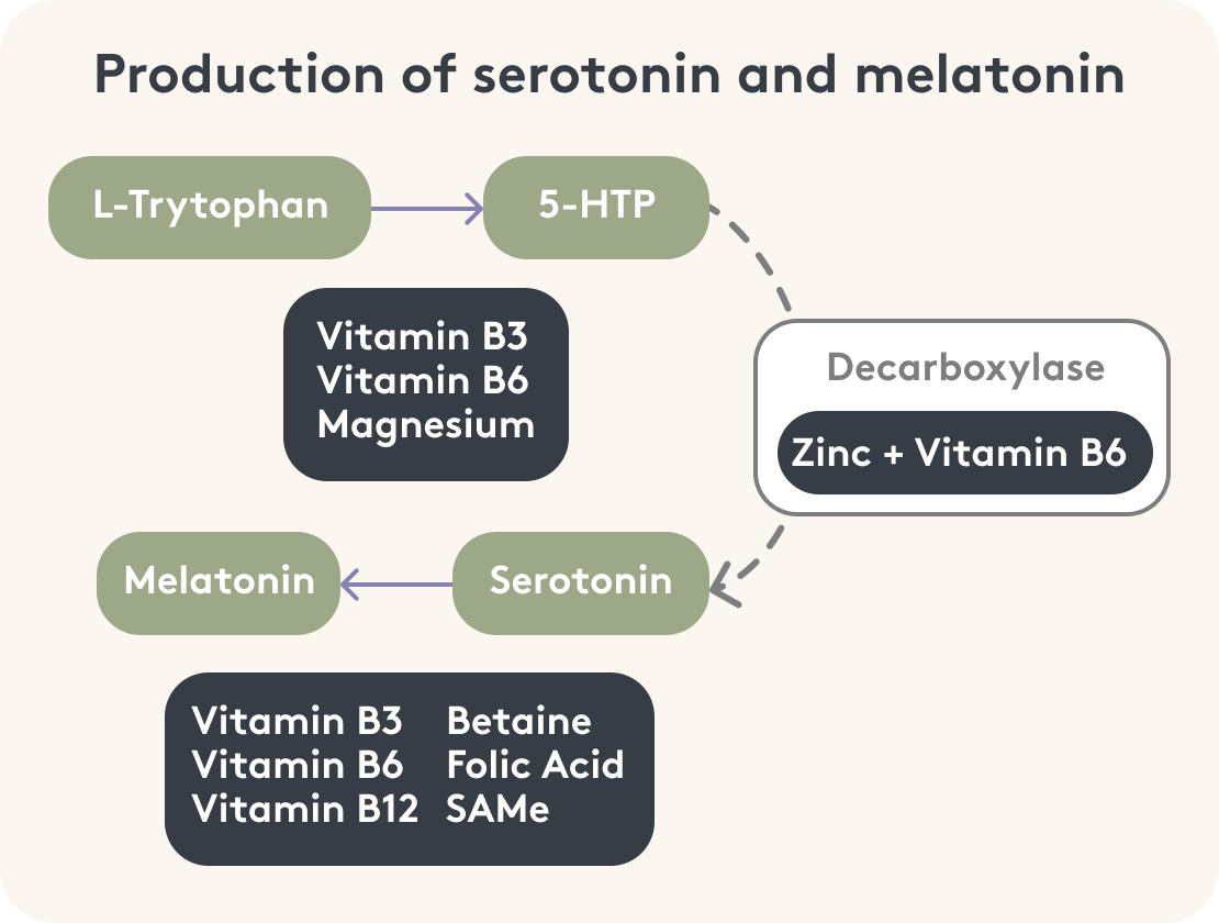 - For the production of the neurotransmitter serotonin from 5-HTP, the co-factors vitamin B3, B6 and magnesium must be available