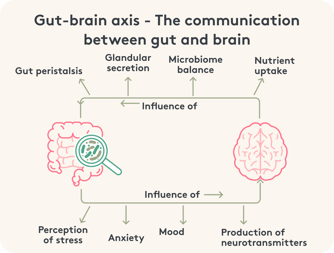 Remarkably, 90% of serotonin —often known as the "happy hormone"—is produced in your gut.⁴ It not only contributes to the regulation of intestinal activity but also influences mood and stress processing . The proverbial "butterflies in the stomach" when we're in love, or that "gut feeling" before an important decision—all of this can be traced, at least in part, to the gut-brain axis.