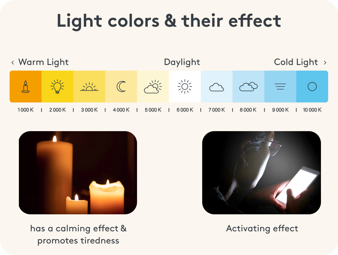 - Warm light, on the other hand, which emulates the evening sun, promotes tiredness.