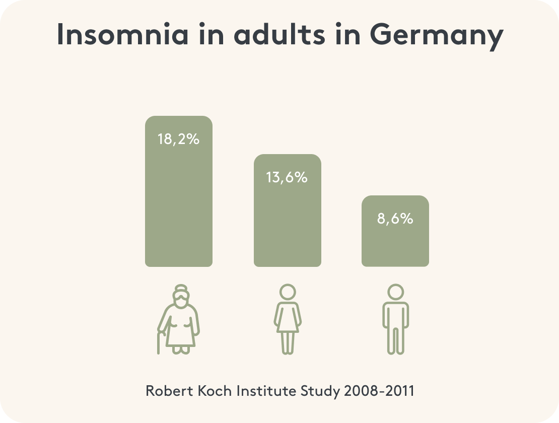 Wie oft klinisch relevante Einschlafstörungen bei Erwachsenen in Deutschland auftreten, hat das Robert Koch-Institut zwischen 2008 und 2011 untersucht. Demnach traten Einschlafstörungen bei 13,6 % der weiblichen Erwachsenen zwischen 18 und 79 Jahren und bei 8,6 % der erwachsenen Männer auf. Women over the age of 60 are even affected in 18.2% of cases.2