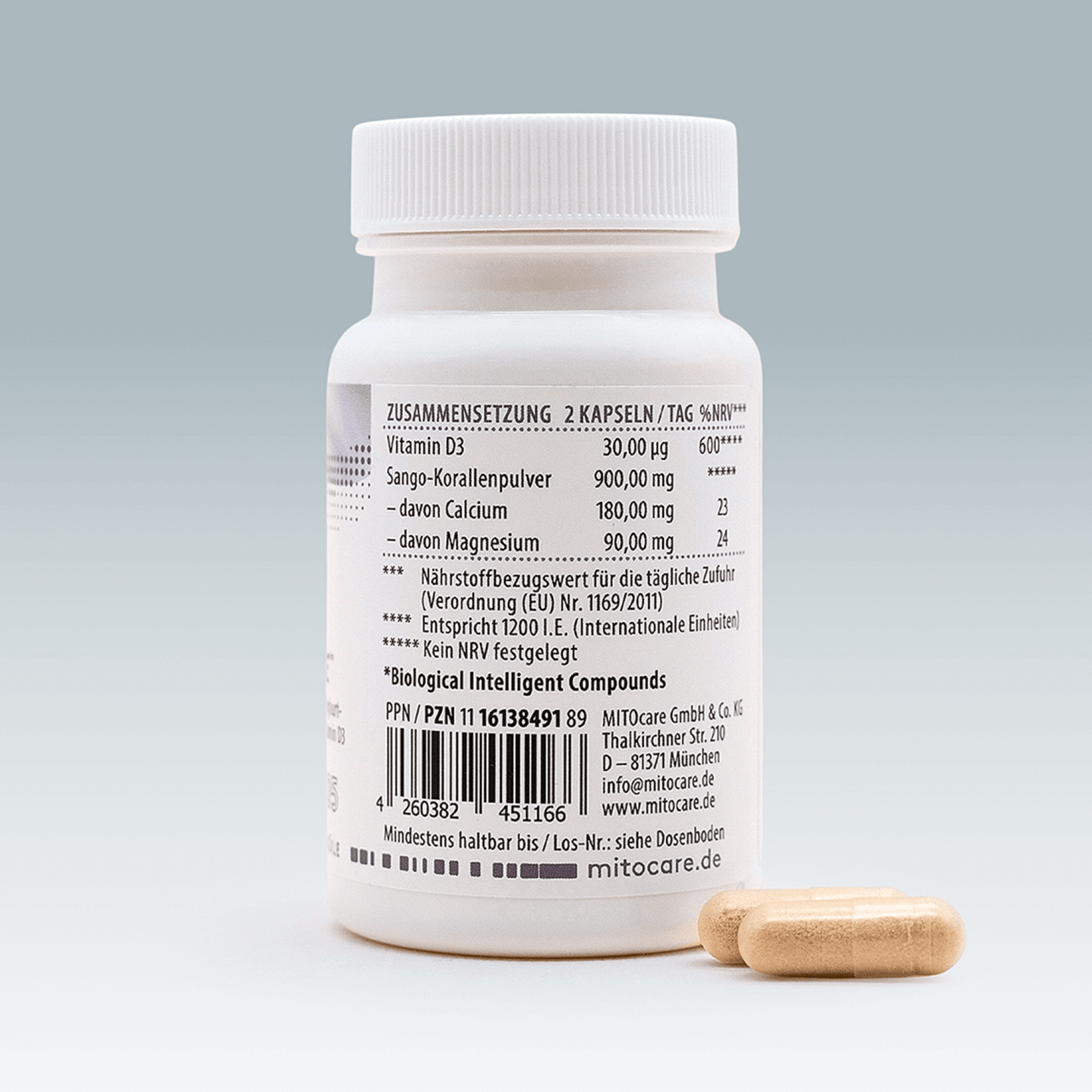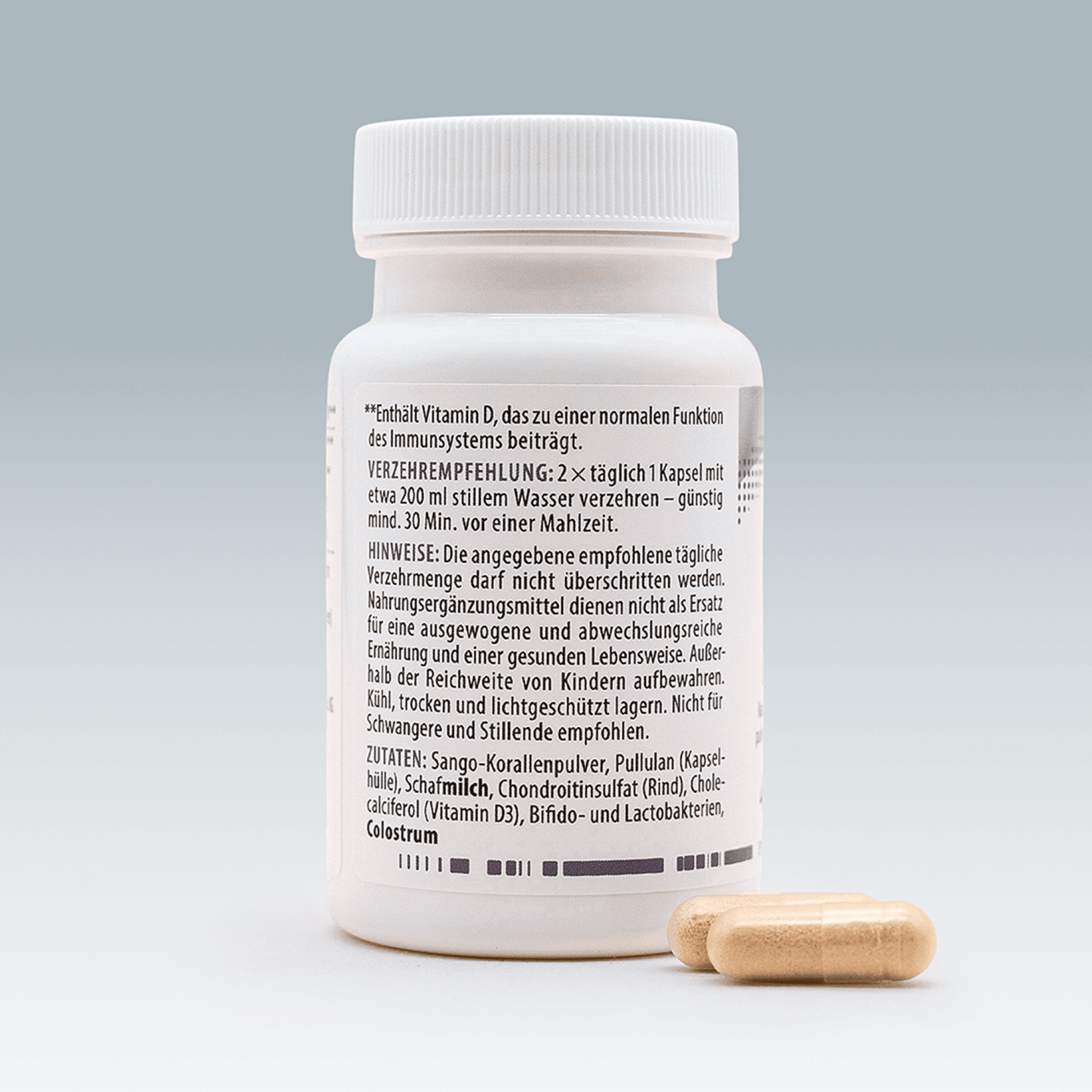 The main feature of this formulation are the BIC components (*=Biological Intelligent Compounds). This is a special yoghurt powder which is obtained through the fermentation of milk with 11 different lactobacteria and bifidobacteria strains. Added to this blend is natural vitamin D3 and colostrum containing at least 18 % of natural immunoglobulins (IgG).  Additionally, the sango ocean coral provides natural calcium and magnesium at the optimum ratio of 2:1.