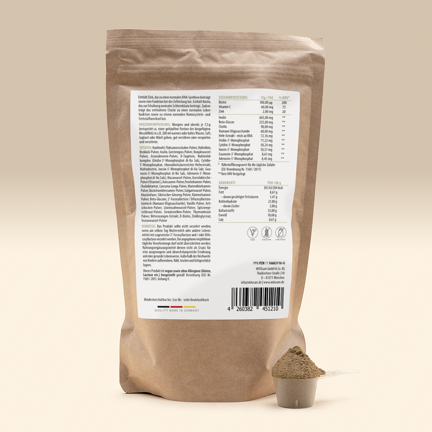 This versatile and high-quality nutrient complex combines a selection of bitter herbs with a rich supply of valuable fiber, including inulin, beta-glucan, konjac and maca root, oat bran, hemp, artichokes, and acacia fiber. Of particular note is the additional use of nucleotides, a yeast extract rich in ribonucleic acid, as well as human oligosaccharides, all of which are also prominently found in breast milk. The use of D-tagatose instead of conventional sugar contributes to the maintenance of tooth mineralization 6 and, together with the vanilla powder, simultaneously increases the taste acceptance of the various bitter substances. Furthermore, natural vitamin C from acerola cherries is also included; together with zinc, it supports the function of the immune system 7 and supports the body's cells in protecting against oxidative stress 8 . Despite the absence of chemical additives, Flora Total is highly soluble in water and is also suitable for a vegan diet.