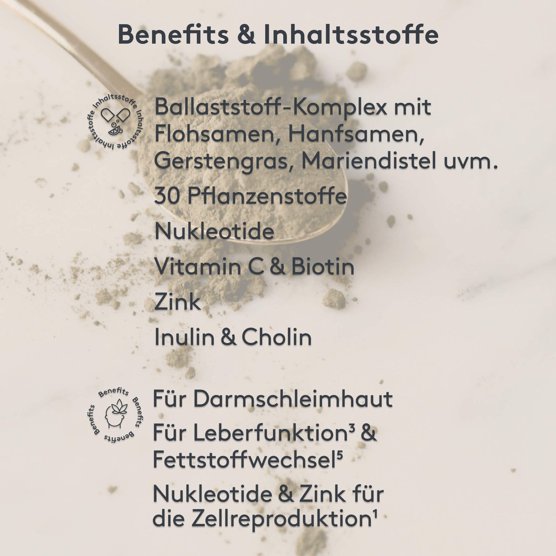 Ingredients : Hemp flour, psyllium husk powder, oat bran, broccoli powder, inulin, barley grass powder, konjac root powder, aronia berry powder, D-tagatose, nucleotide complex (uridine 5'-monophosphate di-Na salt, cytidine 5'-monophosphate, ribonucleic acid-rich yeast extract, maltodextrin, inosine 5'-monophosphate di-Na salt, guanosine 5'-monophosphate di-Na salt, adenosine 5'-monophosphate di-Na salt), maca root powder, acerola cherry powder (vitamin C), anise seed powder, fennel seed powder, choline bitartrate, curcuma longa powder, milk thistle seed powder, fenugreek seed powder, Galangal root powder, acacia fiber, Siberian ginseng powder, caraway seed powder, beta-glucans, 2'-fucosyllactose / difucosyllactose mixture (human oligosaccharides), vanilla powder, artichoke powder, dandelion root powder, ribwort plantain powder, clove powder, thyme powder, bitter orange extract, D-biotin, zinc bisglycinate, gentian root powder