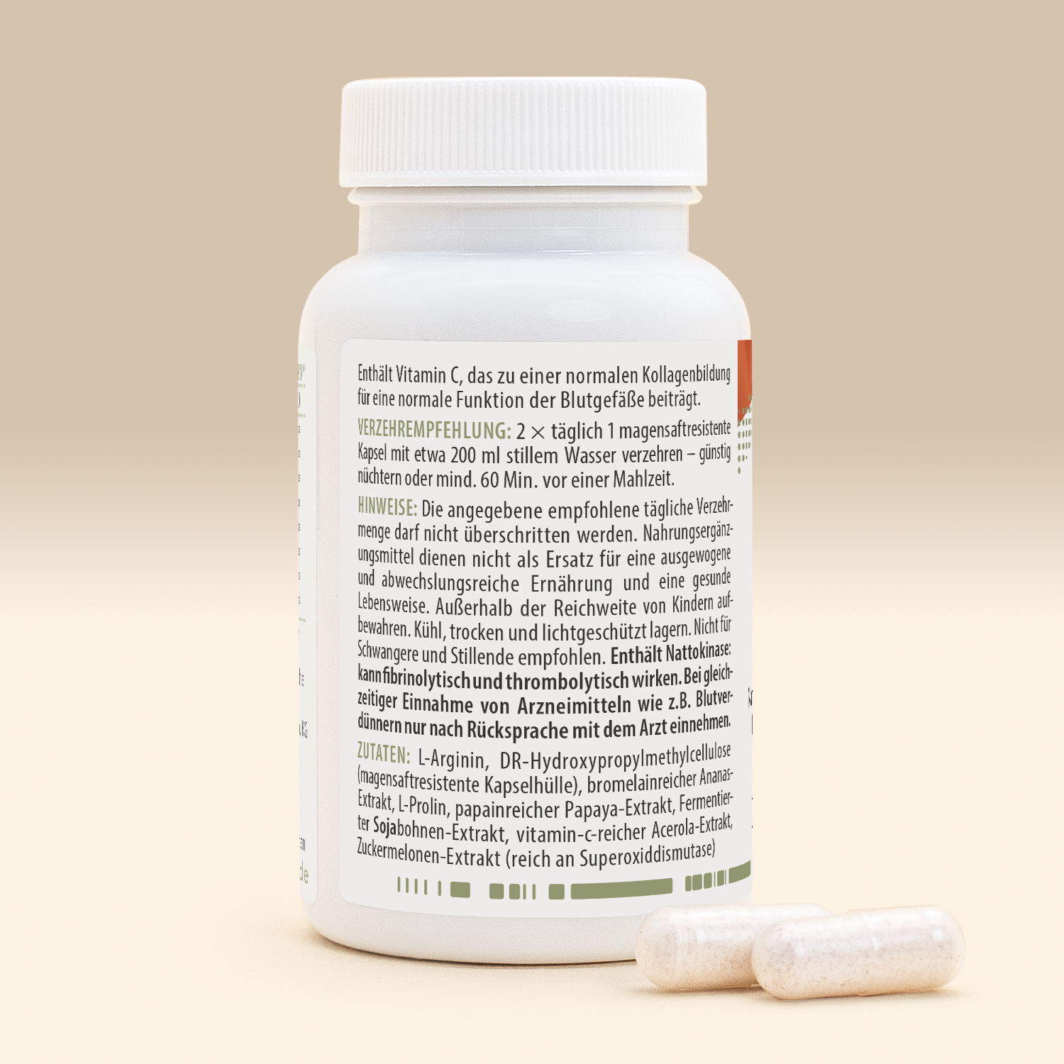 Ingredients: L-arginine, DR-hydroxypropyl methylcellulose (capsule shell - enteric-coated), bromelain-rich pineapple extract, L-proline, papain-rich papaya extract, fermented soybean extract (contains nattokinase), vitamin-c-rich acerola extract, sugar melon extract (rich in superoxide dismutase)