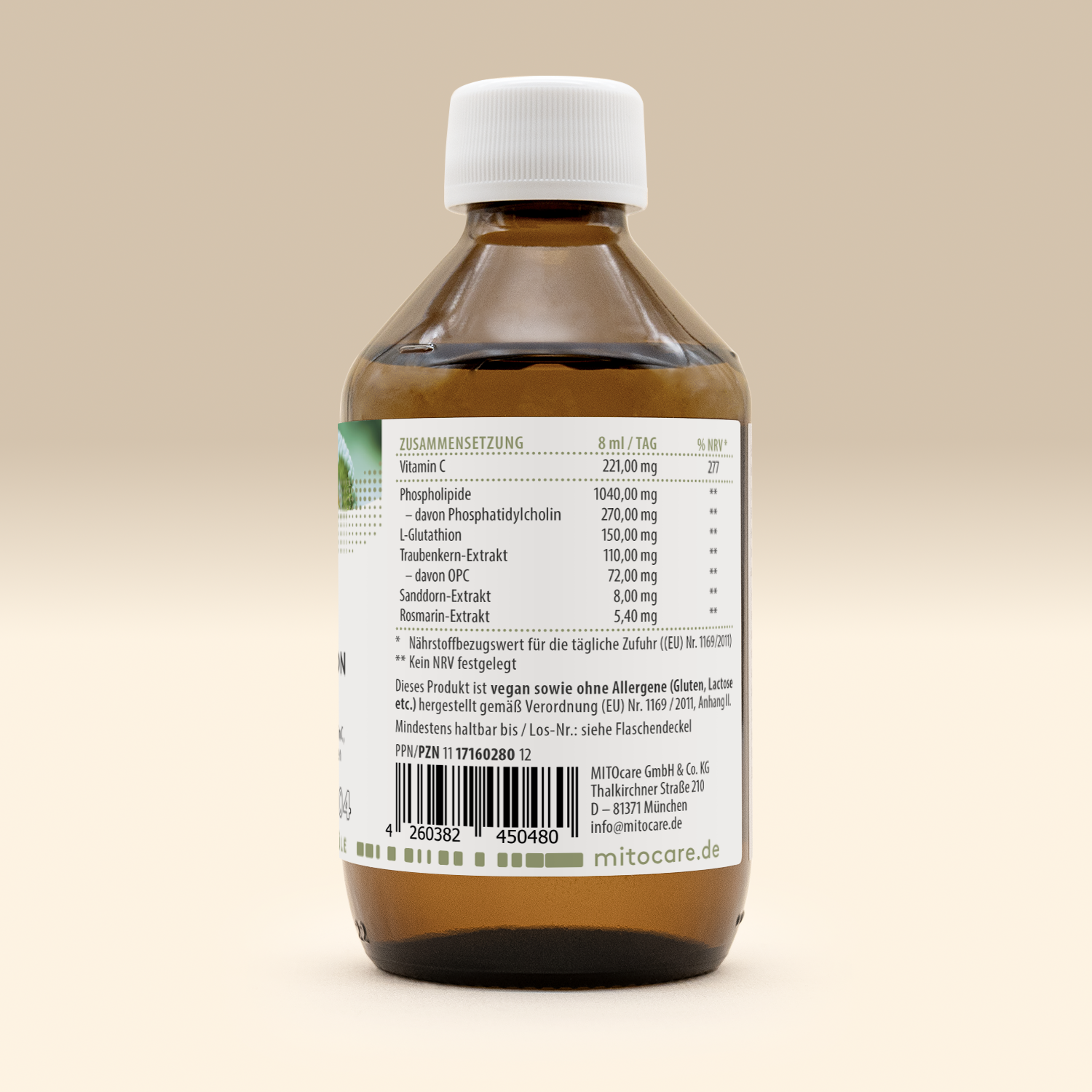 Ingredients: Water, glycerol, phospholipids from sunflower lecithin, L-ascorbic acid (vitamin C), L-glutathione (reduced), OPC from grape seed extract, sea buckthorn extract, rosemary extract, acidifier: citric acid