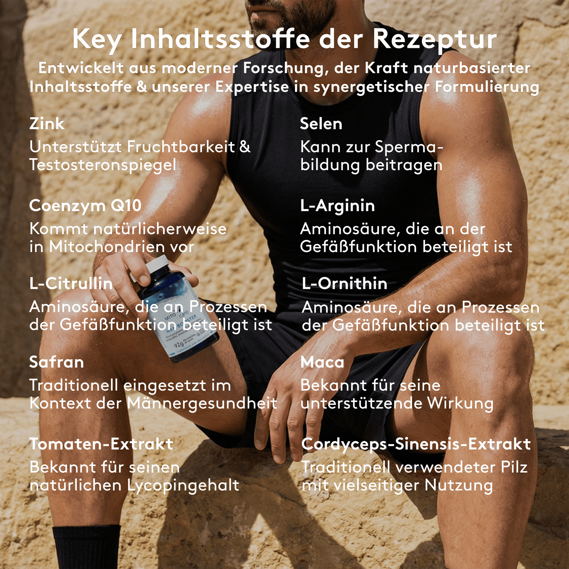 Man Booster was specifically developed for holistic men's health under daily environmental and performance stress. It contains valuable nutrients that support testosterone metabolism¹, energy production³ and sperm formation² and are suitable for men at every stage of life.