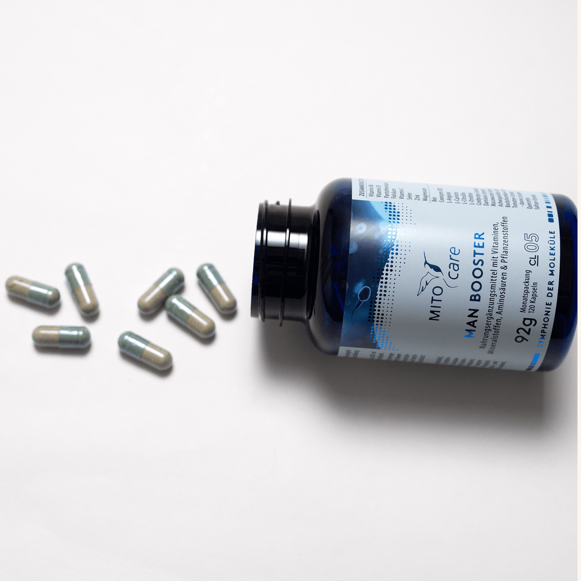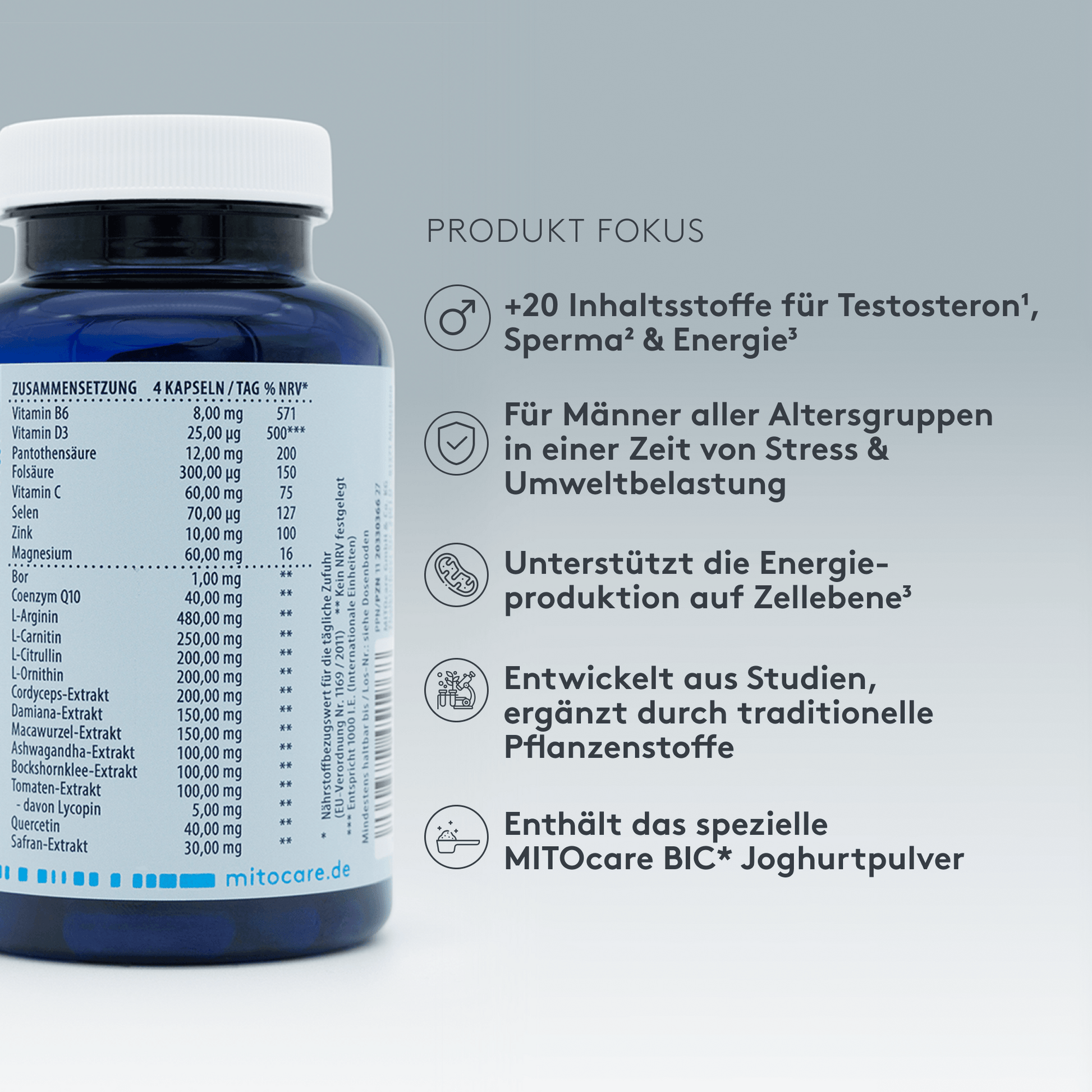 The MITOcare Man Booster follows the Causa Logica Principle – our approach to developing complex formulations not by chance, but specifically along physiological connections. The focus is on combining selected micronutrients and plant substances that are specifically coordinated and meaningfully complement each other in their properties. At the same time, unnecessary fillers & additives are deliberately avoided to ensure a clear, high-quality formula. The development is carried out by our in-house team of experts based on current scientific findings and is also guided by the example of nature. Regular laboratory analyses ensure consistently high quality & purity of the raw materials used.