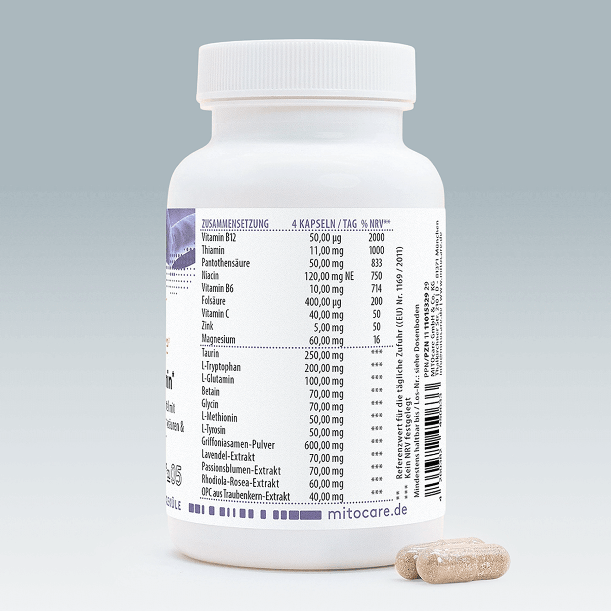 Our product NEUROtonin* contains the B-vitamin pantothenic acid, which is known to be a cofactor in neurotransmitter synthesis2. Furthermore, the vitamins B1 B6, B12 and C contribute to maintaining the health of the nervous system1. Together with folate they also contribute to normal mental function3. The product is rounded off with other ingredients such as betaine, glycine, glucosamine and taurine as well as plant substances such as rhodiola rosea, lavender and passion flower.