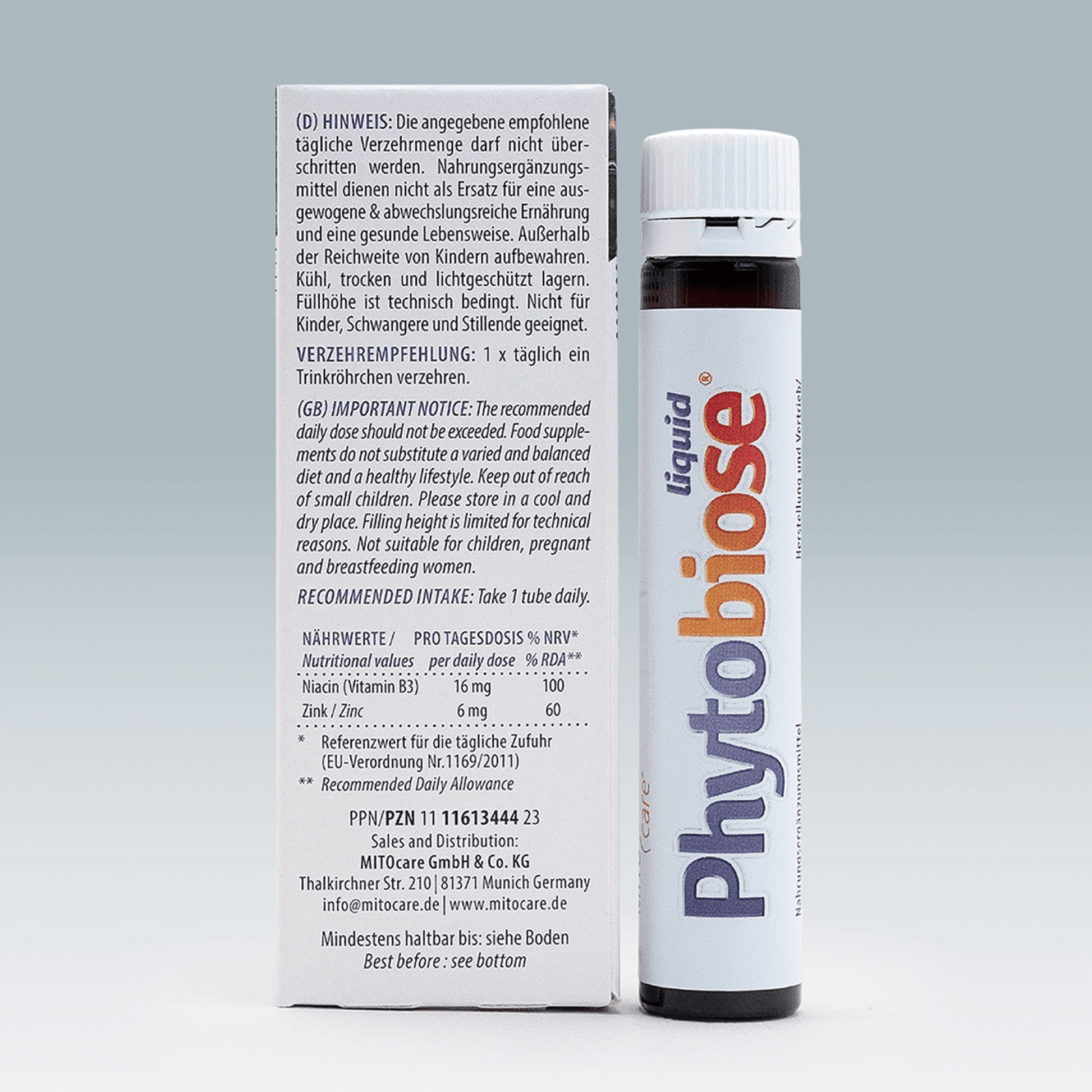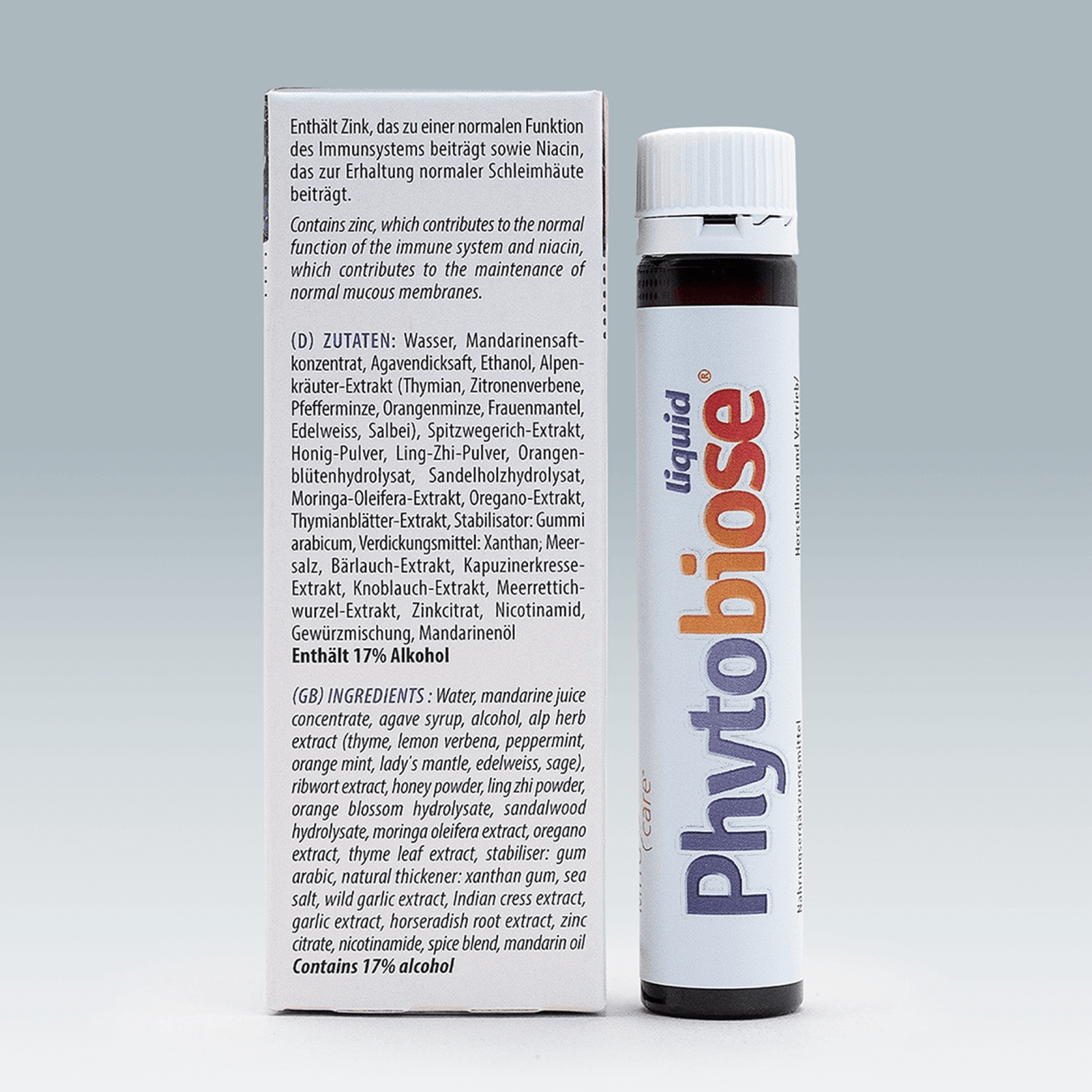 Phytobiosis Liquid is a natural liquid product containing eight plant extracts, honey powder, lingzhi powder, mandarin oil, orange blossom hydrolysate, sandalwood hydrolysate, ribwort and a special herb mixture. Niacin contributes to maintaining healthy mucous membranes1 and zinc supports the normal function of the immune system2.