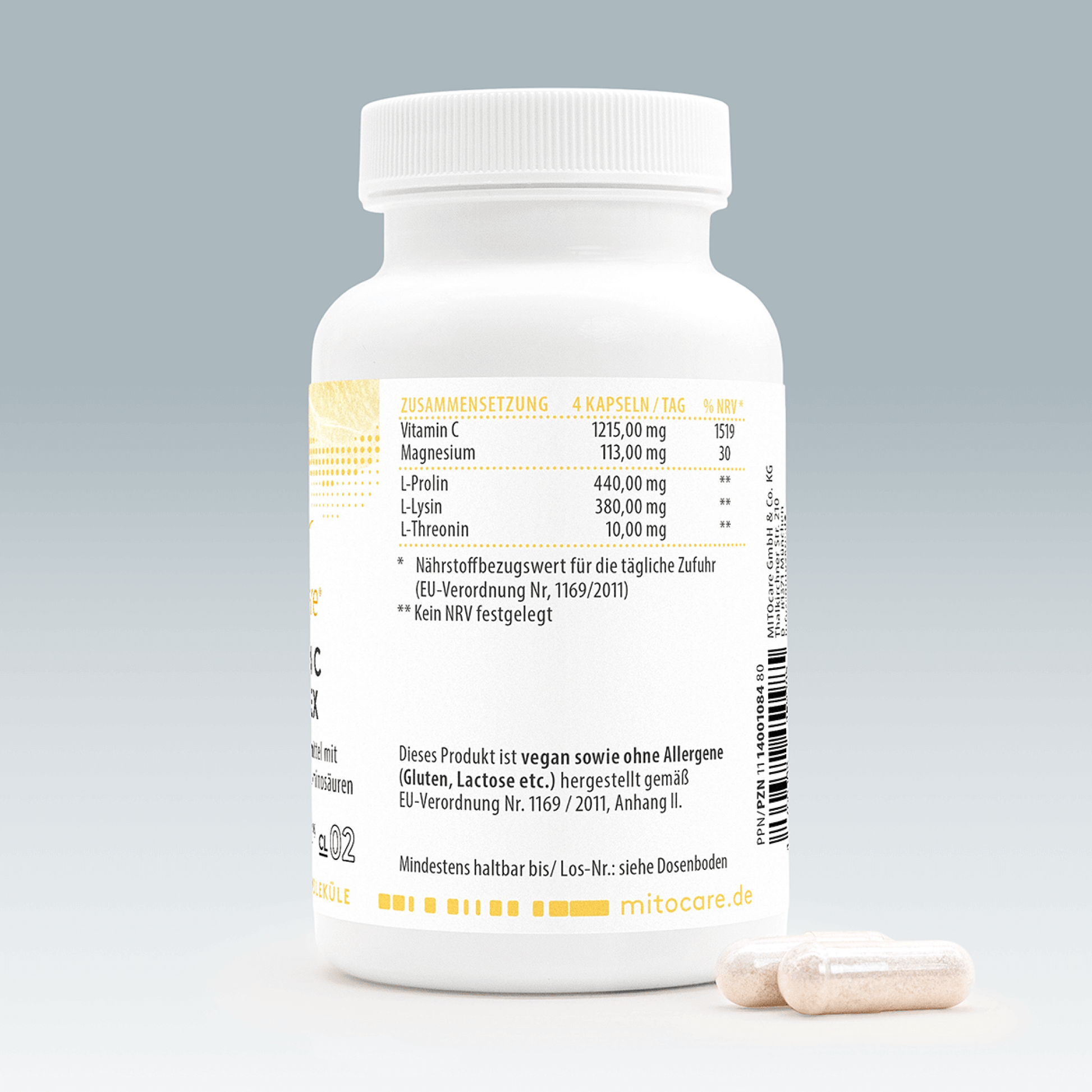 Ingredients: Magnesium L-ascorbate, L-lysine hydrochloride, pullulan (capsule shell, size 00), L-proline, camu camu extract, L-ascorbyl-6-palmitate, L-threonine