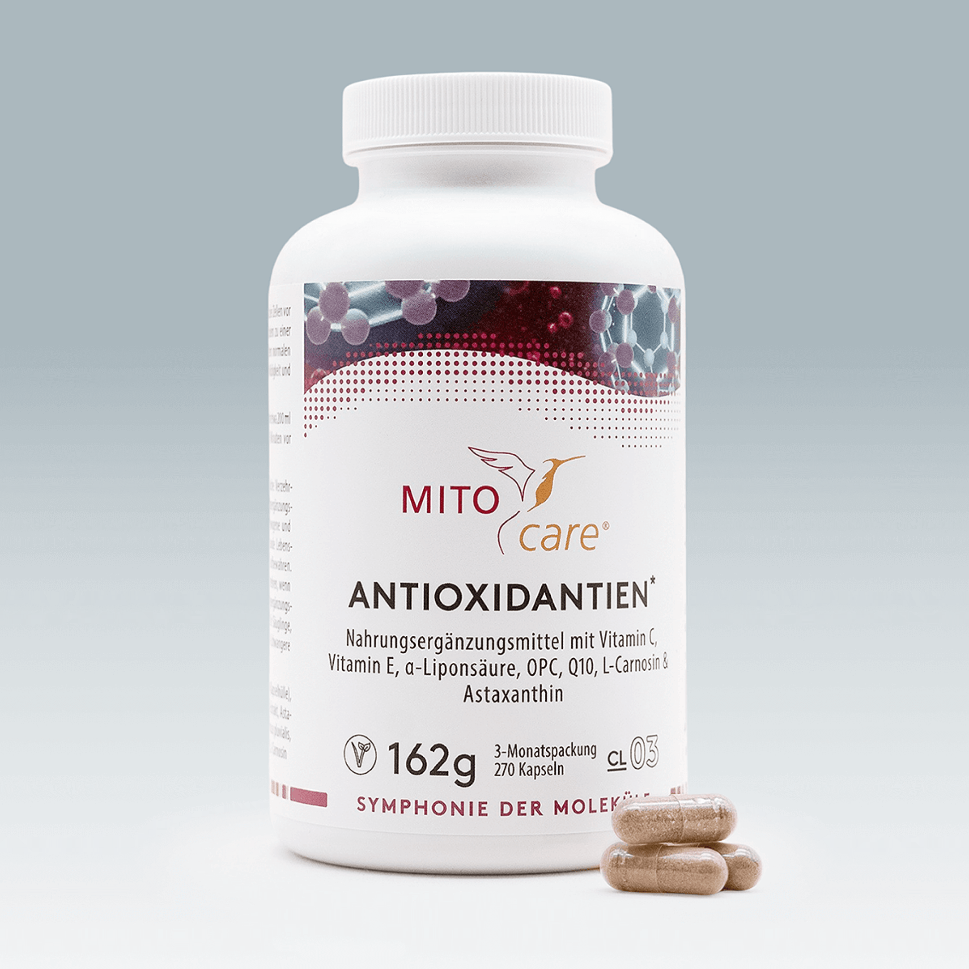 Antioxidantien* ist ein veganes Produkt mit hochwertigen Inhaltsstoffen. Das Produkt vereint antioxidative Stoffe wie Vitamine C und E sowie weitere besondere Stoffe wie Alpha-Liponsäure, Coenzym Q10 und sekundäre Pflanzenstoffe zu einer einzigartigen Komplexmischung - vorwiegend konzipiert gegen oxidativen Stress1.