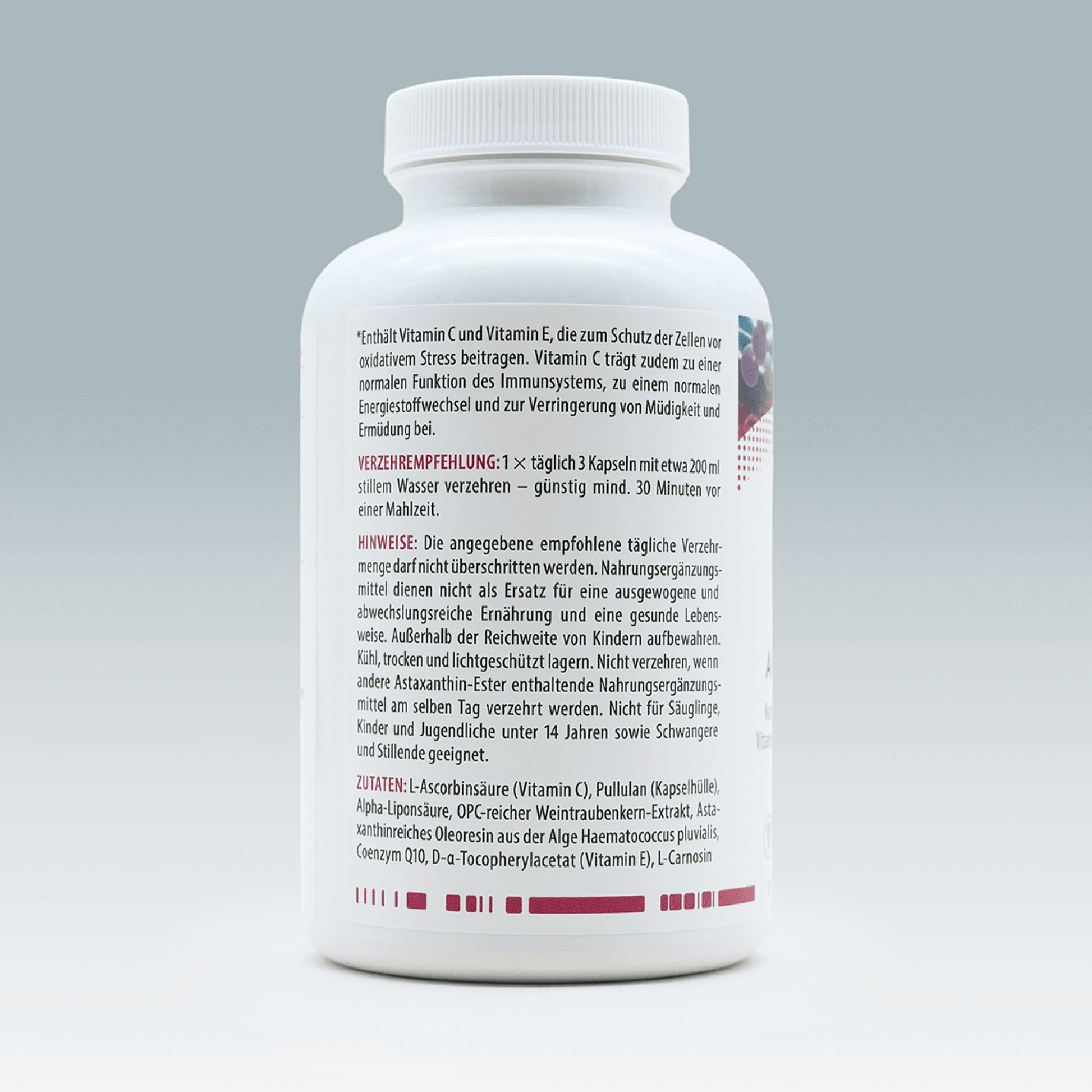 Nahrungsergänzungsmittel mit Vitamin C, Vitamin E, Alpha-Liponsäure, OPC, Coenzym Q10 und Astaxanthin