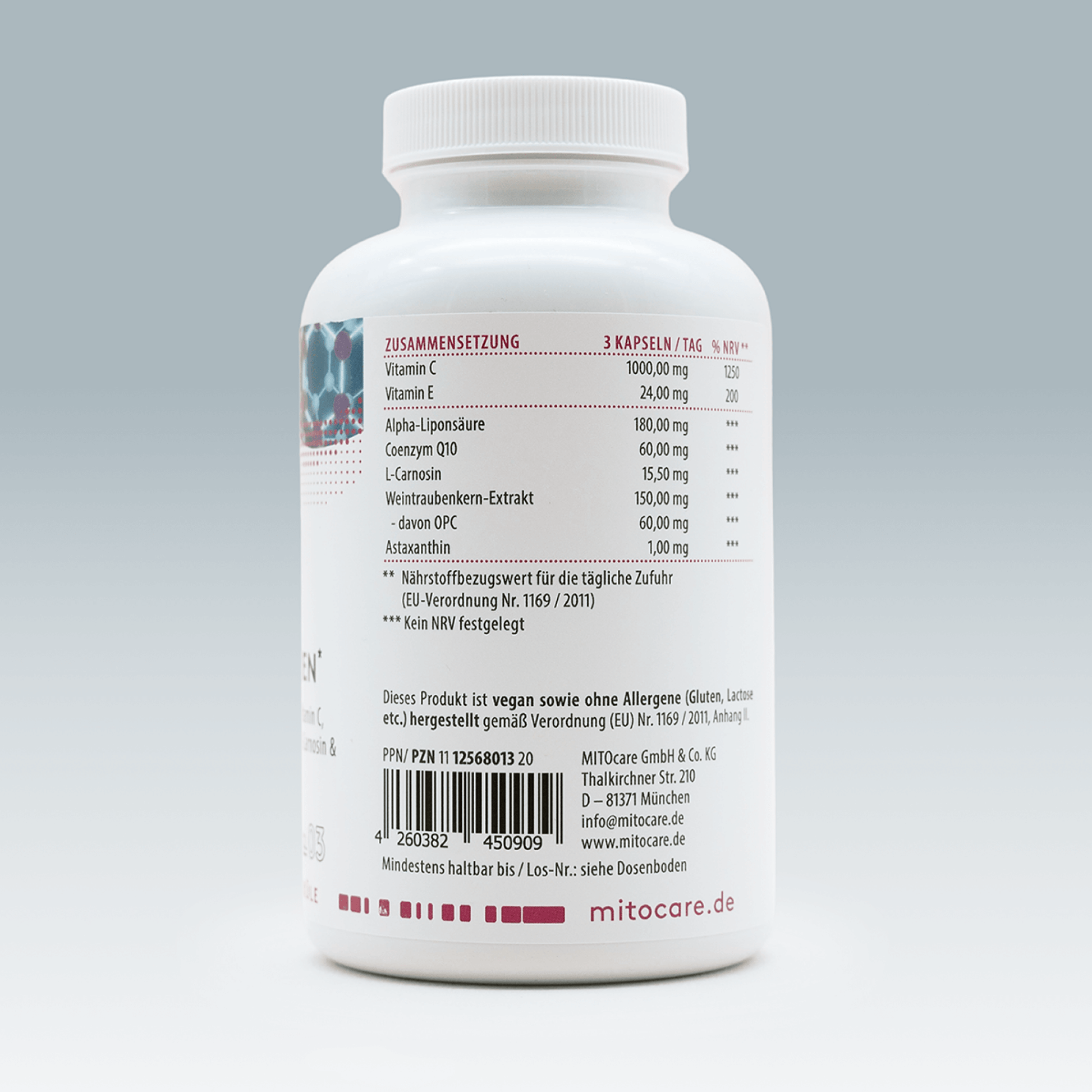 Zutaten: L-Ascorbinsäure (Vitamin C), Pullulan (Kapselhülle, Gr. 0), Alpha-Liponsäure, OPC-reicher Weintraubenkern-Extrakt, Astaxanthinreiches Oleoresin aus der Alge Haematococcus pluvialis, Coenzym Q10, D-α-Tocopherylacetat (Vitamin E), L-Carnosin