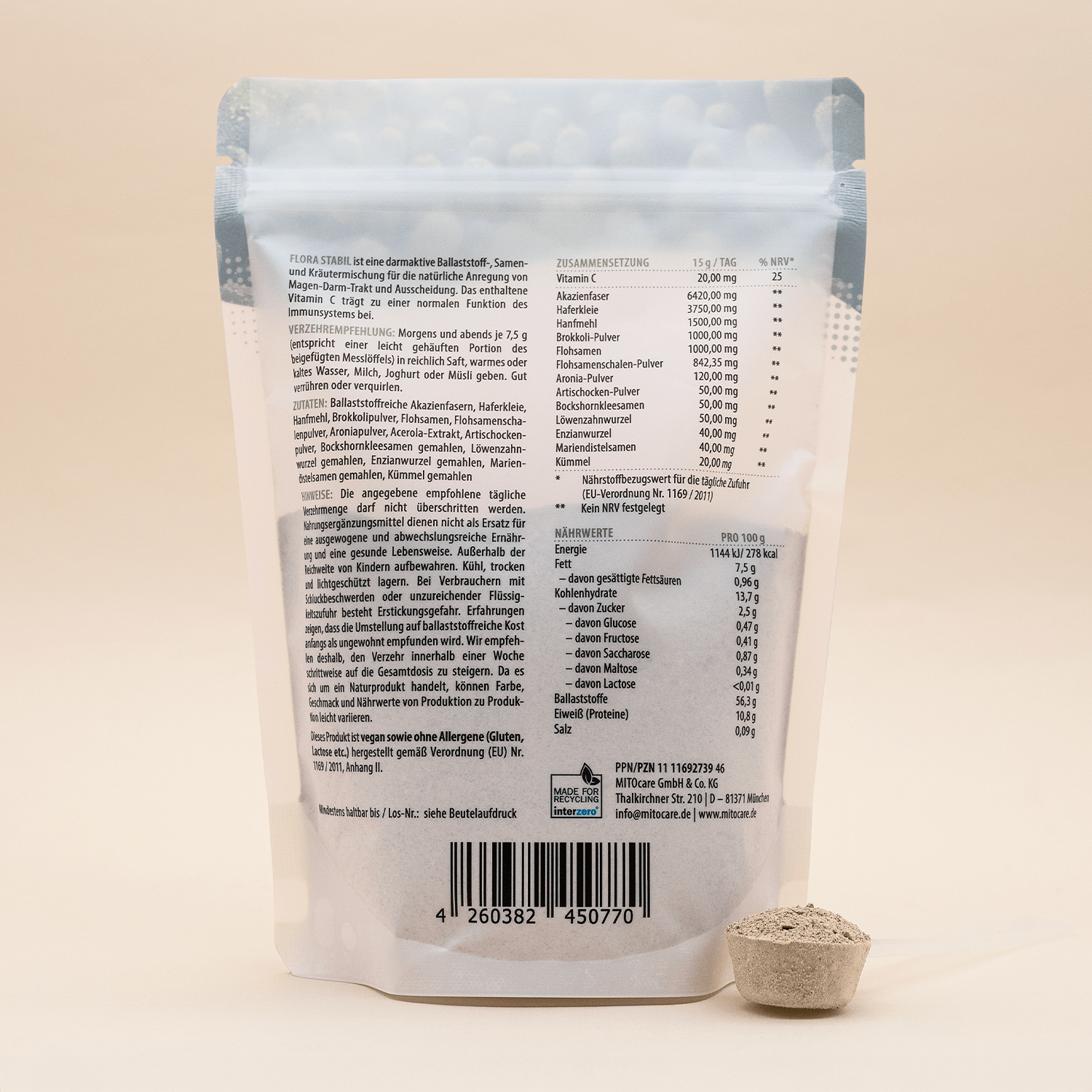 Unser Produkt Bio Flora Stabil ist ein sorgfältig zusammengestellter veganer Ballaststoff-Komplex mit 14 Nähr- und Pflanzenstoffen. Alle Inhaltsstoffe stammen dabei aus kontrolliert biologischem Anbau. Das enthaltene Vitamin C trägt zu einem intakten Immunsystem1 sowie zu einem gesunden Energiestoffwechsel2 bei. Die Verpackung ist hierbei zu 100 % recyclebar.