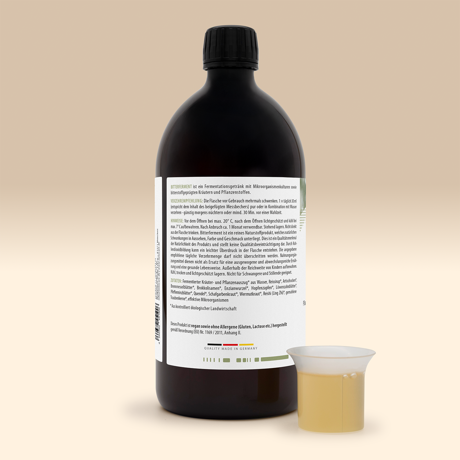 Unser Bitterferment aus kontrolliert biologischem Anbau entsteht durch die mehrstufige Fermentation wertvoller, naturbelassener Bitterpflanzen in Kombination mit einem besonderen Mikroorganismenprofil. Das Ergebnis ist ein ausgewogenes Zusammenspiel biozertifizierter Bitterkräuter, wie u.a. Artischocken, Enzianwurzel und Wermutkraut und 16 verschiedener widerstandsfähiger, lebender Kulturen in einem stabilen Milieu.