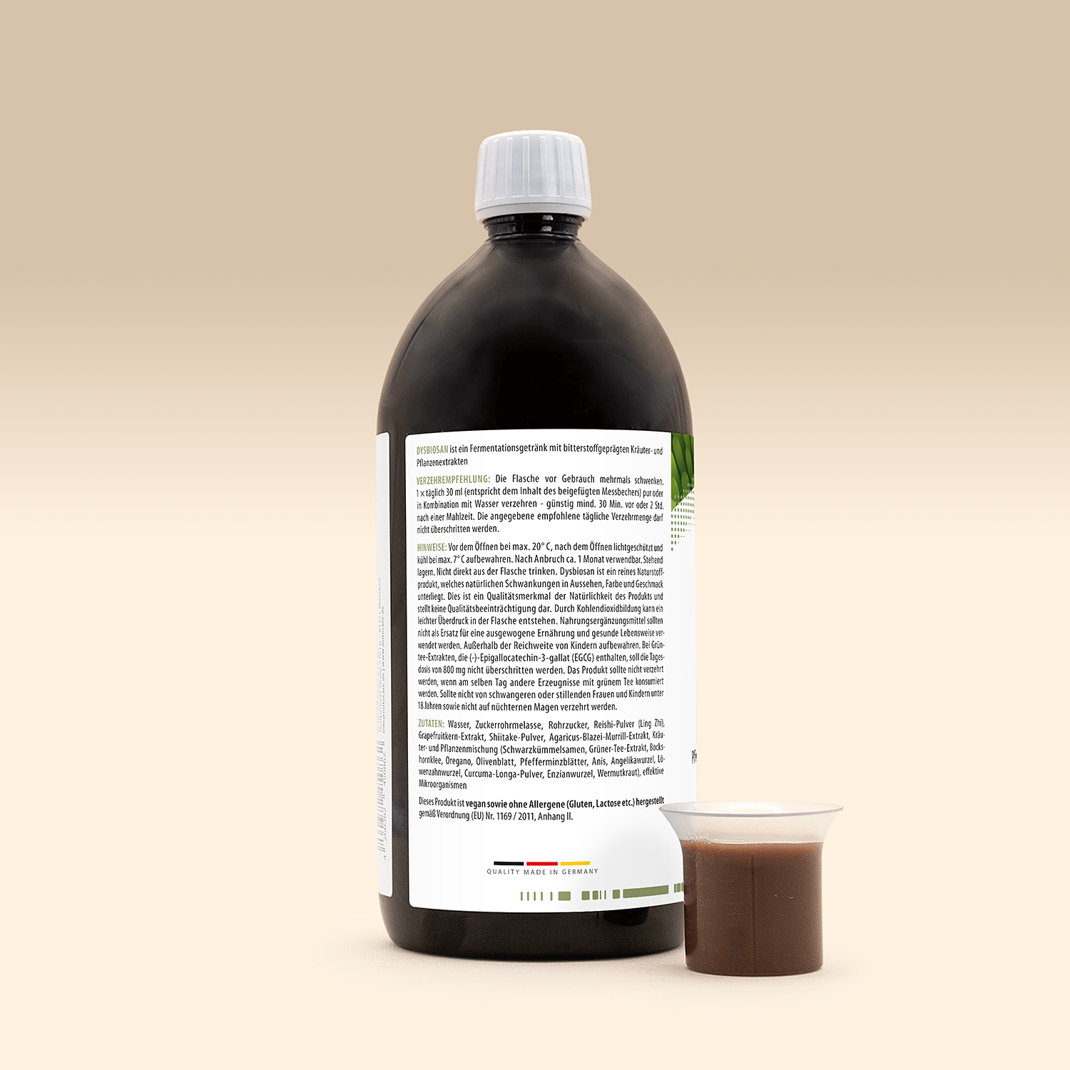 Das Naturstoffprodukt Dysbiosan enthält über 24 Stämme von effektiven Mikroorganismen in hoher Dosierung, sowie Bitterstoff, Kräuter und Pflanzenextrakte.