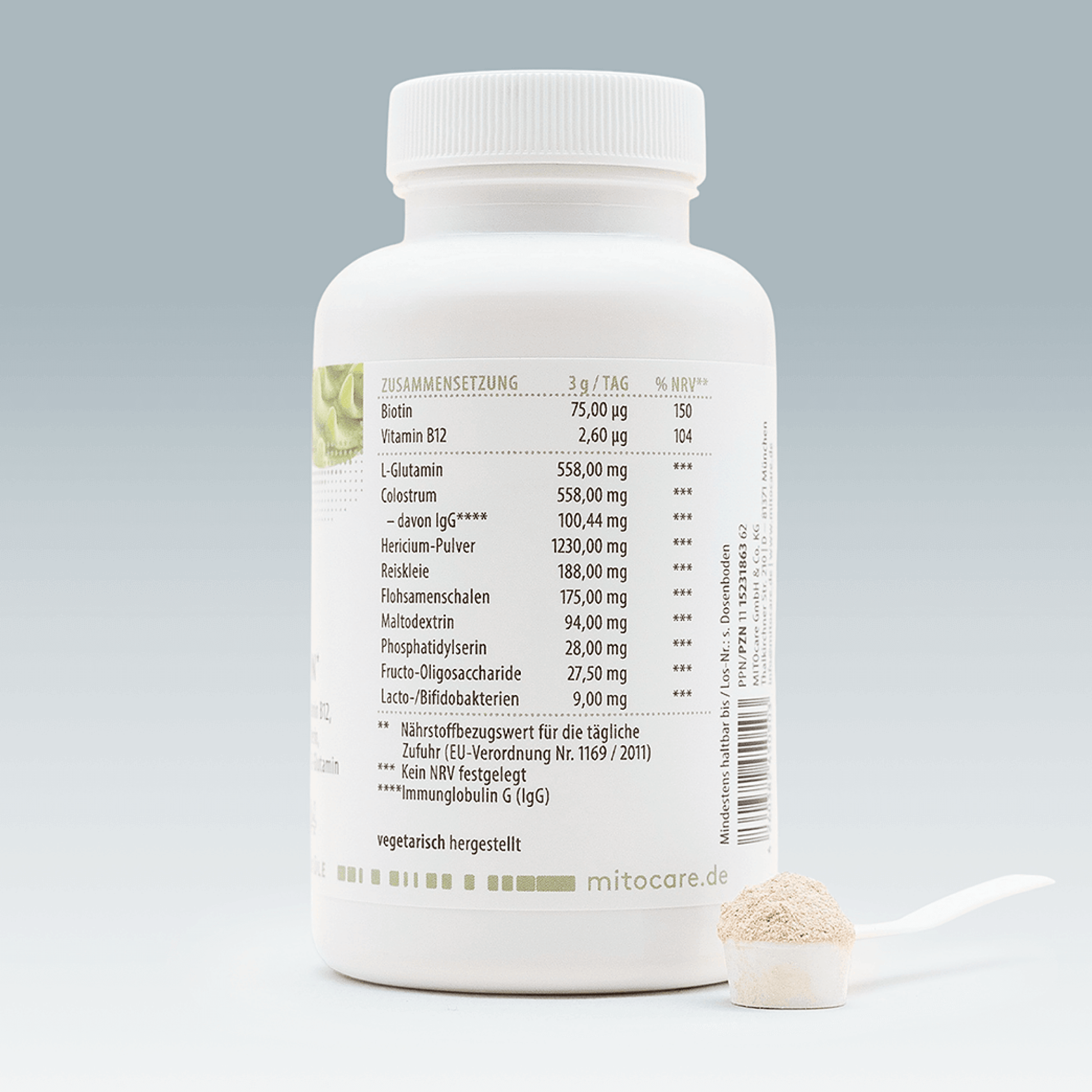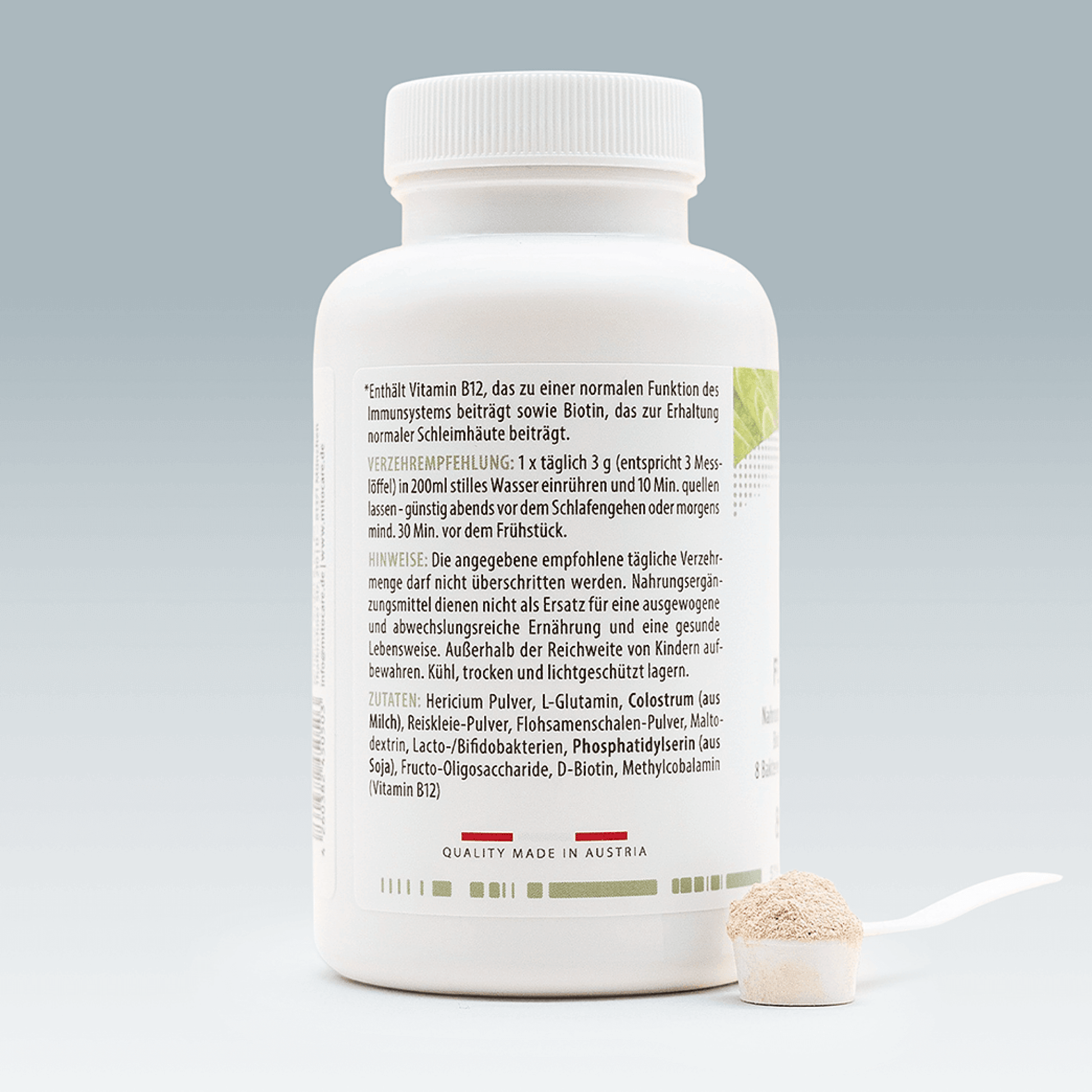 Zutaten: Hericium-Pulver, L-Glutamin, Colostrum (aus Milch), Reiskleie-Pulver, Flohsamenschalen-Pulver, Maltodextrin, Lacto-/Bifidobakterien, Phosphatidylserin (aus Soja), Fructo-Oligosaccharide, D-Biotin, Methylcobalamin (Vitamin B12)