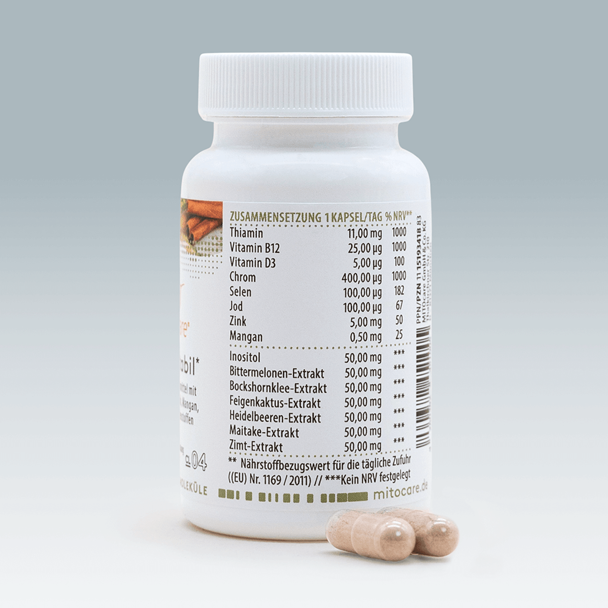 Zutaten: Pullulan(Kapselhülle Gr. 0), Bittermelonen-Extrakt, Bockshornklee-Extrakt, Feigenkaktus-Extrakt, Heidelbeeren-Extrakt, Maitake-Extrakt, Zimt-Extrakt, Inositol, Zinkgluconat, Methylcobalamin, Thiaminhydrochlorid, Kaliumiodid, Chrompicolinat, Cholecalciferol, Mangancitrat, Natriumselenit, Reismehl