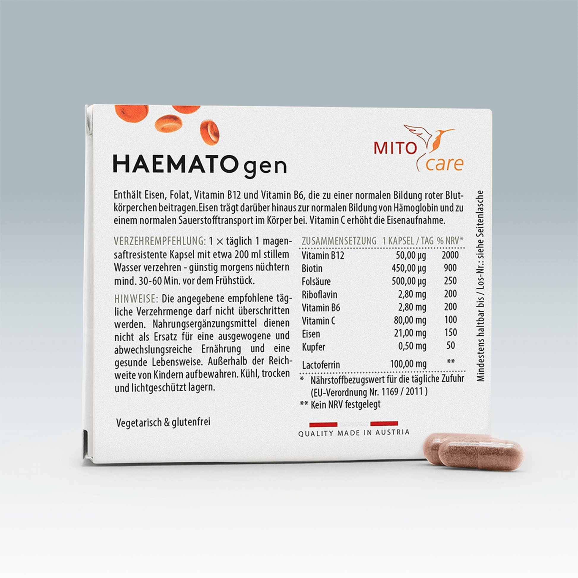 Wir verwenden für unser HAEMATOgen ausschließlich wertvolle Nährstoffe - geschützt in einer veganen Kapselhülle aus Pullulan mit verzögerter Freisetzung. Wir verzichten bewusst auf unnötige Füll- und Hilfsstoffe.