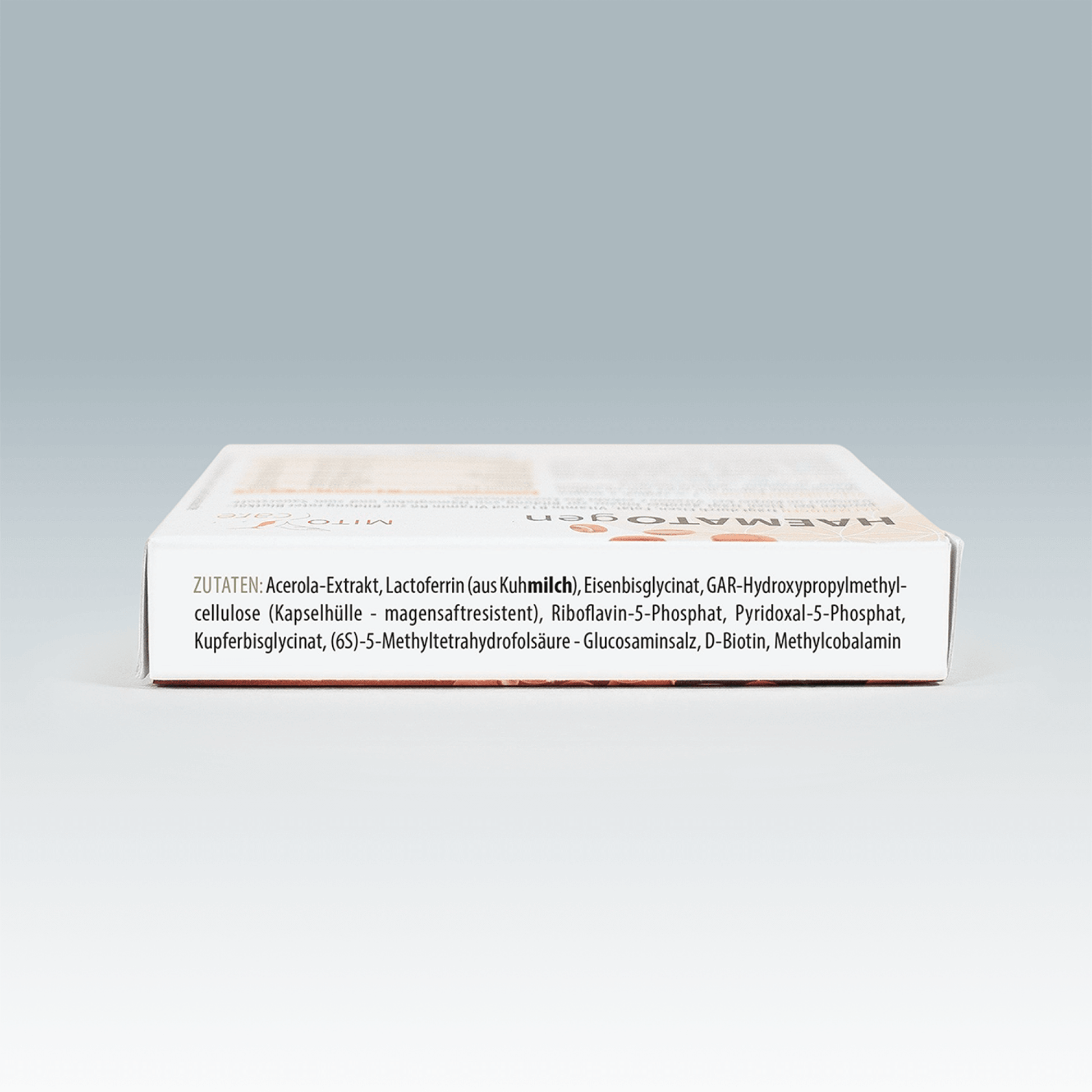 HAEMATOgen contiene hierro en forma quelada como bisglicinato de hierro, que, como compuesto orgánico, facilita la absorción en el organismo. También se incluyen vitamina C natural para una buena absorción del hierro 5 y cobre para un transporte saludable del hierro en el cuerpo 9 . Además del uso de vitaminas B puramente bioactivas, cabe destacar el uso de la valiosa lactoferrina, que, entre otras cosas, funciona como proteína de transporte de hierro y se une al hierro libre en el organismo.
