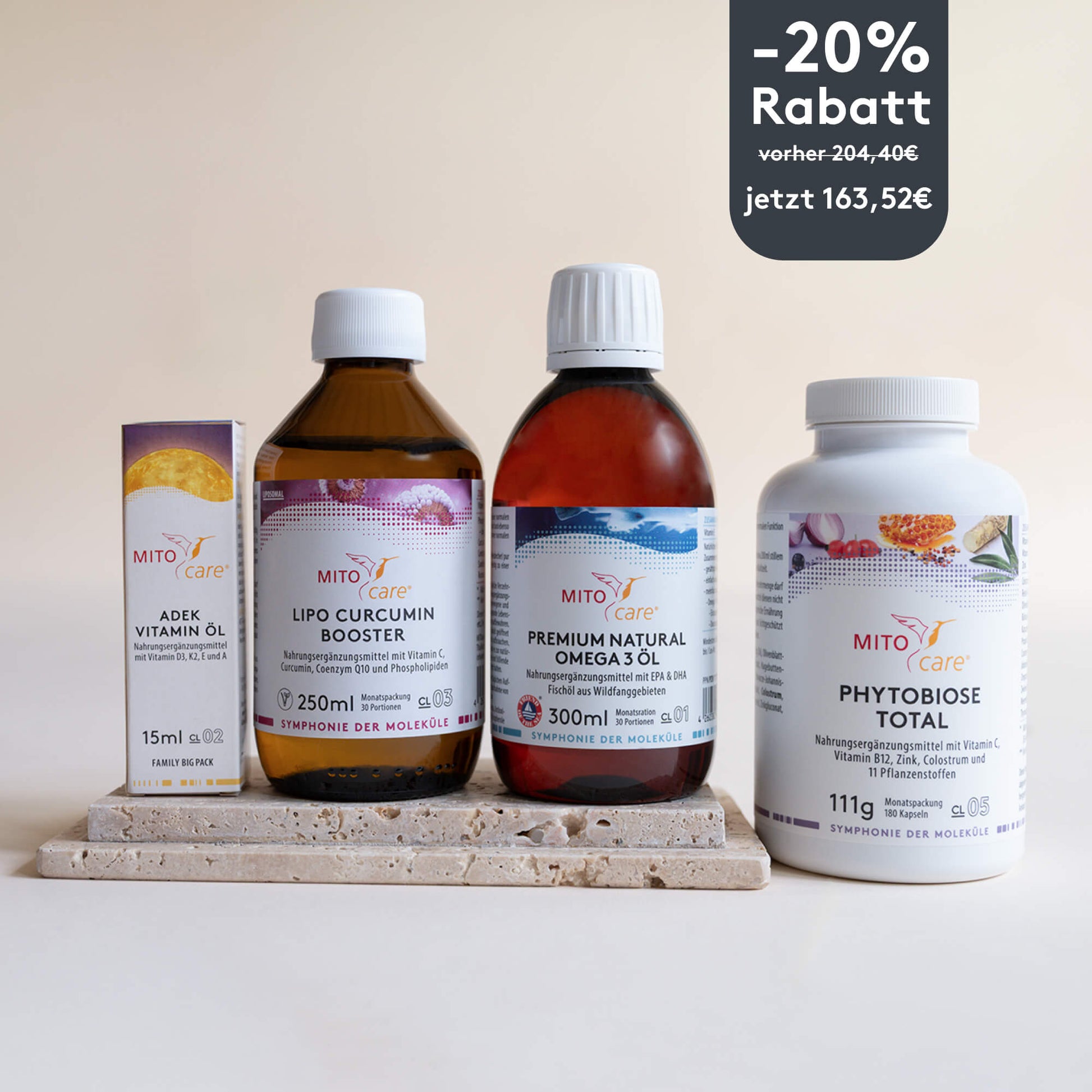 Paket: 1x ADEK Vitamin Öl | 1x Lipo Curcumin Booster | 1x Premium Natural Omega 3 Öl | 1x Phytobiose Total