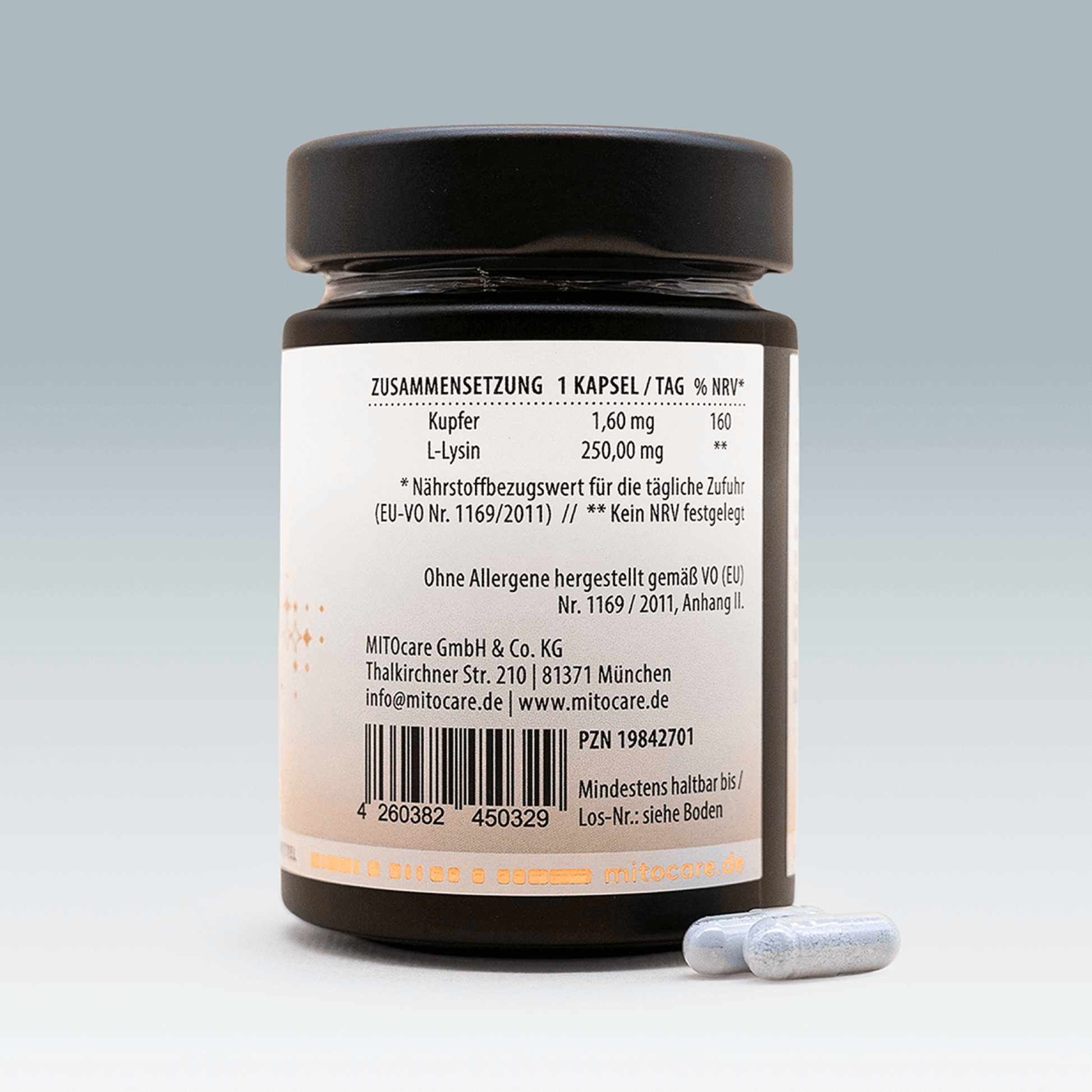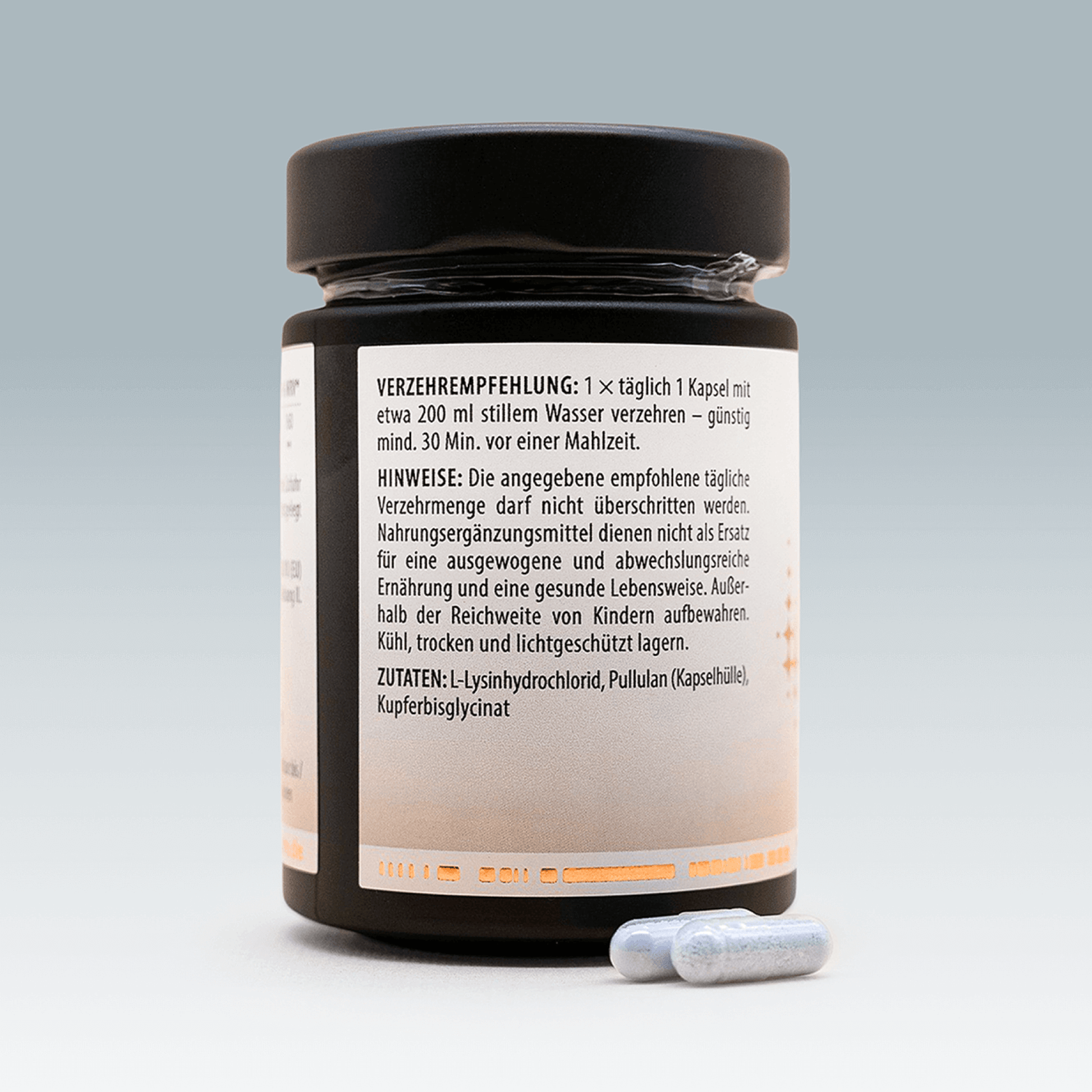 Zutaten: L-Lysinhydrochlorid, Pullulan (Kapselhülle Gr. 1), Kupferbisglycinat