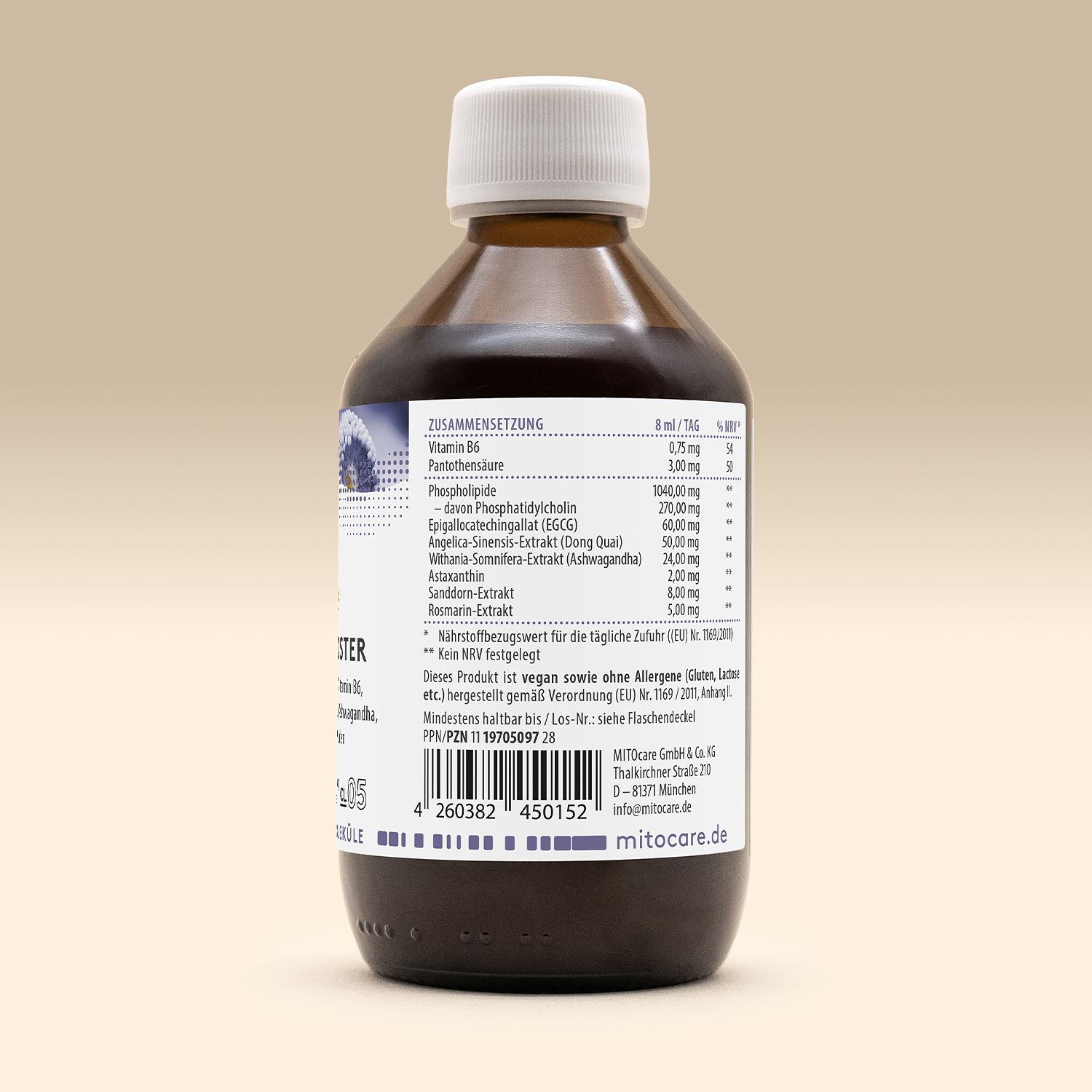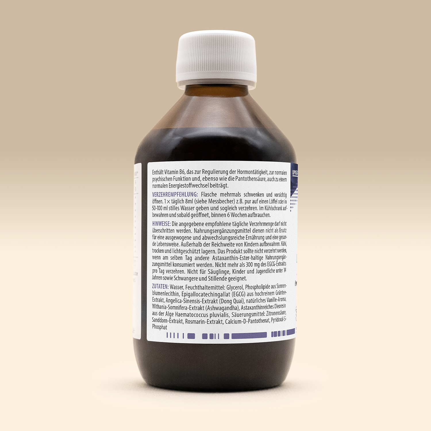 La forma activa de la vitamina B6, envasada en liposomas, contribuye al equilibrio hormonal 1 , al equilibrio psíquico 2 y al sistema nervioso. 3 y – además del ácido pantoténico que contiene – contribuye al buen estado físico general 4,5 . El ácido pantoténico también juega un papel en la síntesis y metabolismo de hormonas esteroides como el estrógeno y varios neurotransmisores 6 y es un cofactor para el rendimiento mental 7 . En la vida cotidiana, un equilibrio hormonal positivo suele estar asociado con una piel, un cabello y unas uñas bonitas, así como con el bienestar general de la mujer.