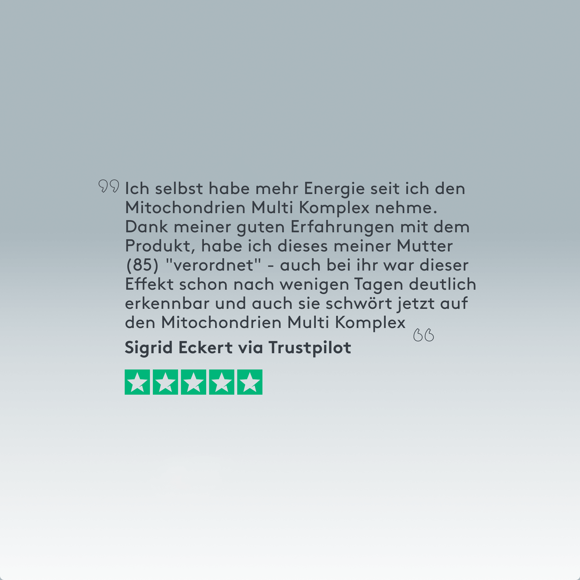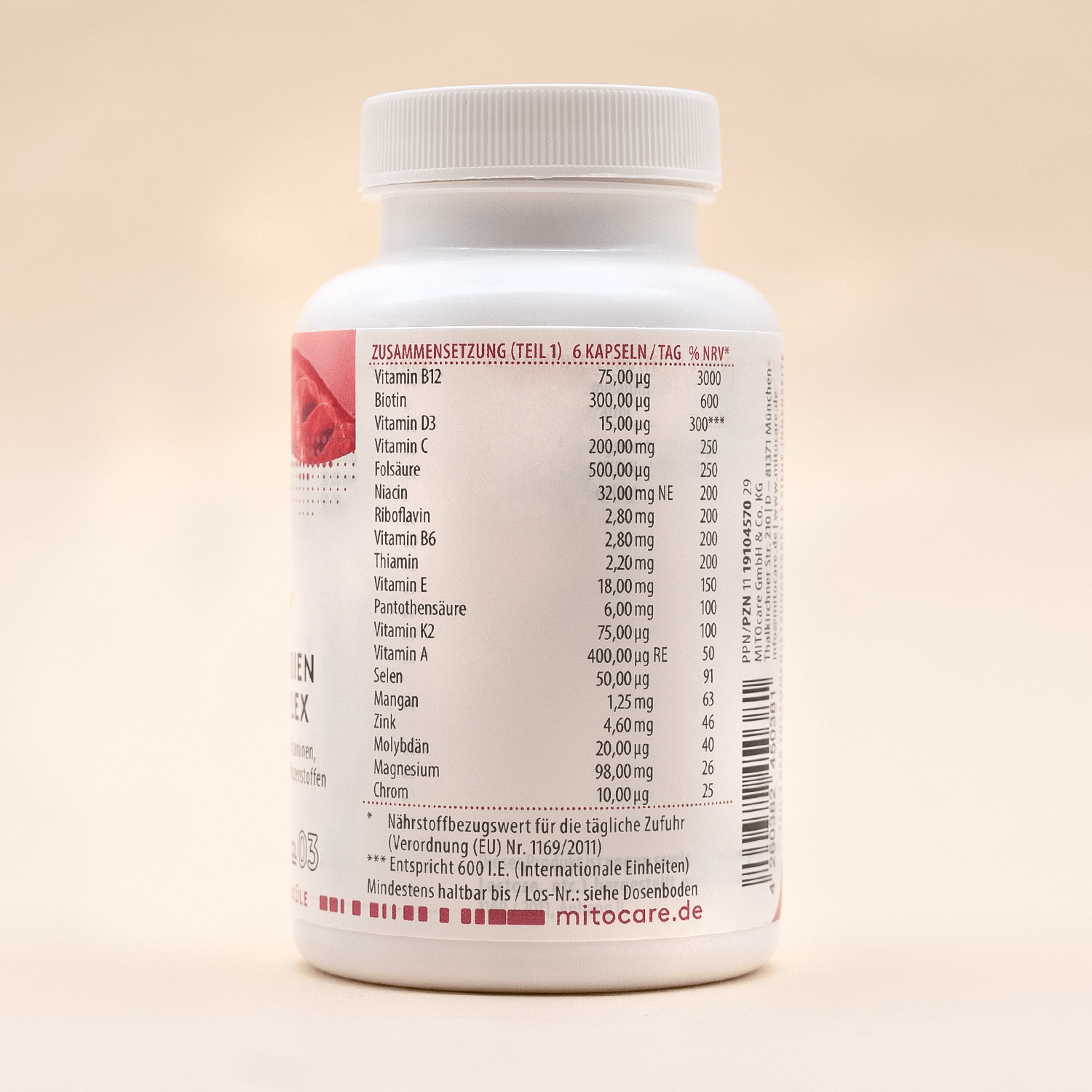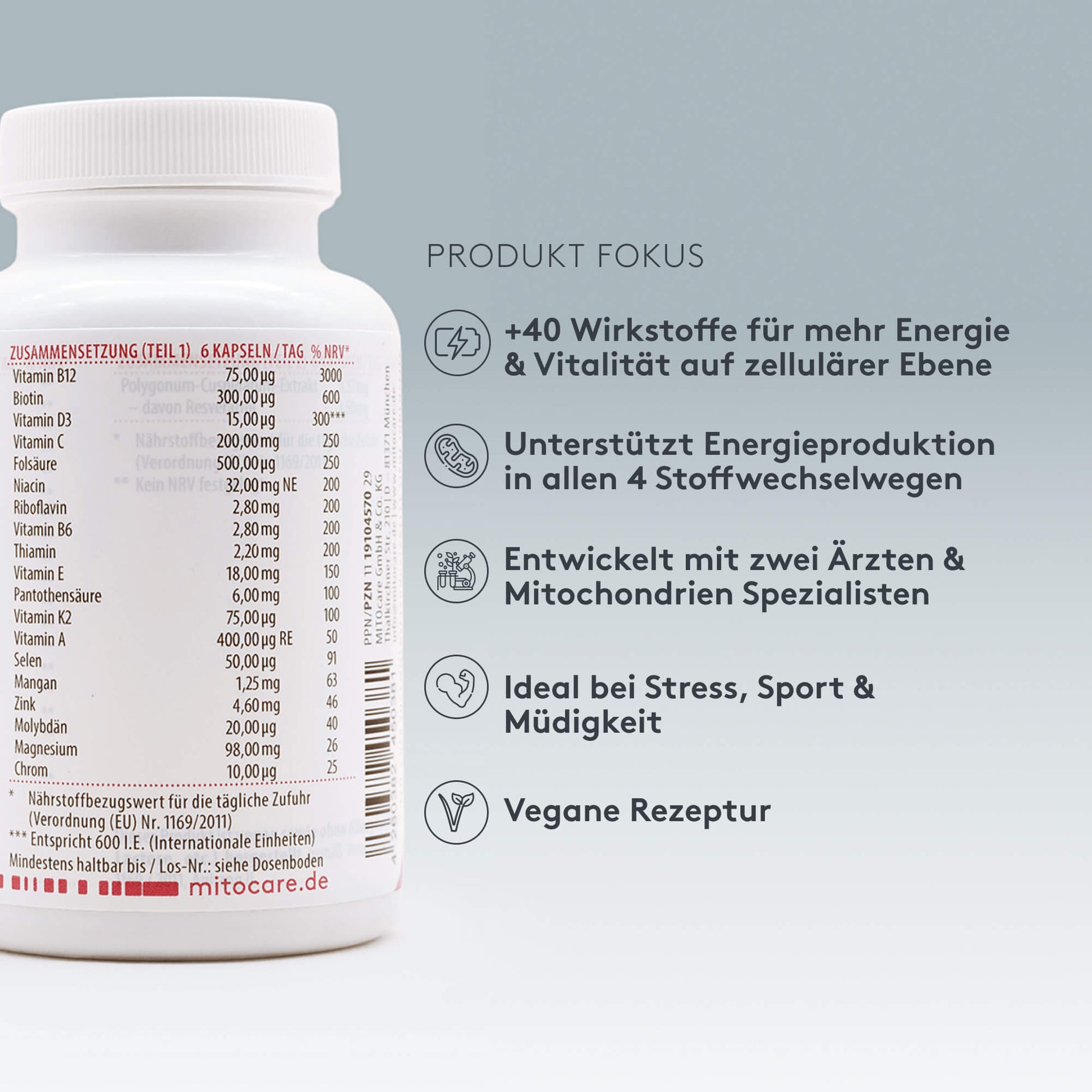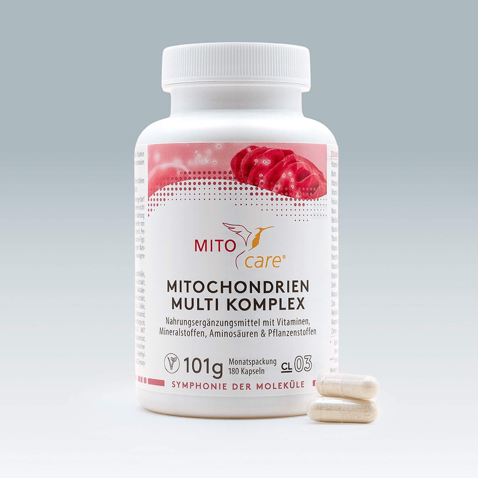 Nuestro producto Mitochondria Multi Complex es un complejo variado de nutrientes y sustancias vegetales veganos que contiene, entre otras cosas, las 13 vitaminas, varios minerales y aminoácidos, ácido alfa lipoico, coenzima Q10, taurina y varias sustancias vegetales como OPC, quercetina, resveratrol y hongos tradicionales. Además, las vitaminas del complejo B conocidas como cofactores del metabolismo energético se utilizan en forma bioactiva, como la riboflavina, la niacina, la vitamina B6 y la vitamina B12 como adenosilcobalamina 1 . Éstos también contribuyen a una menor fatiga con la vitamina C y el magnesio que contienen 2 .