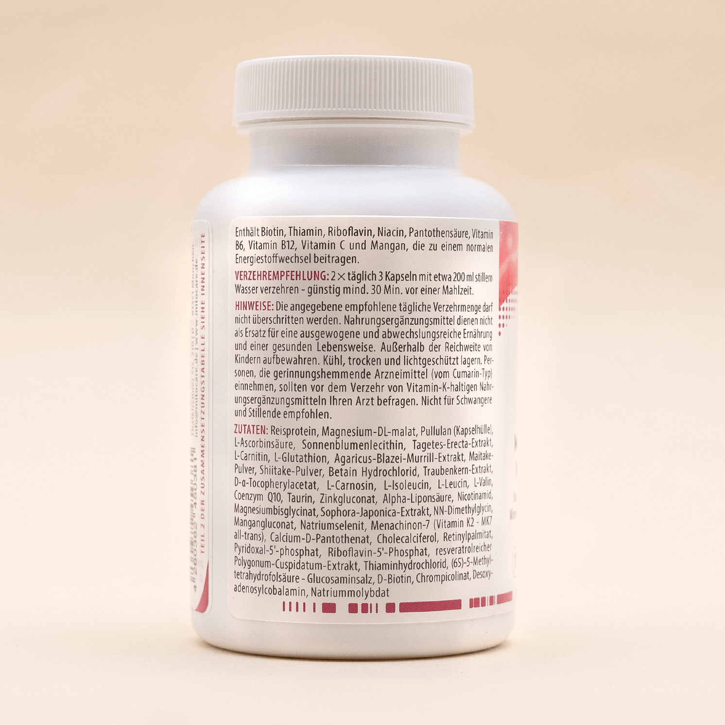 Zutaten: Reisprotein, Magnesium-DL-malat, Pullulan (Kapselhülle Gr. 0), L-Ascorbinsäure (Vitamin C), Sonnenblumenlecithin, Tagetes-Erecta-Extrakt, L-Carnitin, L-Glutathion, Agaricus-Blazei-Murrill-Extrakt, Maitake-Pulver, Shiitake-Pulver, Betain Hydrochlorid, Traubenkern-Extrakt, D-α-Tocopherylacetat (Vitamin E), L-Carnosin, L-Isoleucin, L-Leucin, L-Valin, Coenzym Q10, Taurin, Zinkgluconat, Alpha-Liponsäure, Nicotinamid (Vitamin B3), Magnesiumbisglycinat, quercetinreicher Sophora-Japonica-Extrakt, NN-Dimethylglycin, Mangangluconat, Natriumselenit, Menachinon-7 (Vitamin K2 - MK7 all-trans), Calcium-D-Pantothenat (Vitamin B5), Cholecalciferol (Vitamin D3), Retinylpalmitat (Vitamin A), Pyridoxal-5′-phosphat (Vitamin B6), Riboflavin-5′-Phosphat (Vitamin B2), resveratrolreicher Polygonum-Cuspidatum-Extrakt, Thiaminhydrochlorid (Vitamin B1), (6S)-5-Methyltetrahydrofolsäure - Glucosaminsalz, D-Biotin, Chrompicolinat, Natriummolybdat, Desoxyadenosylcobalamin (Vitamin B12)