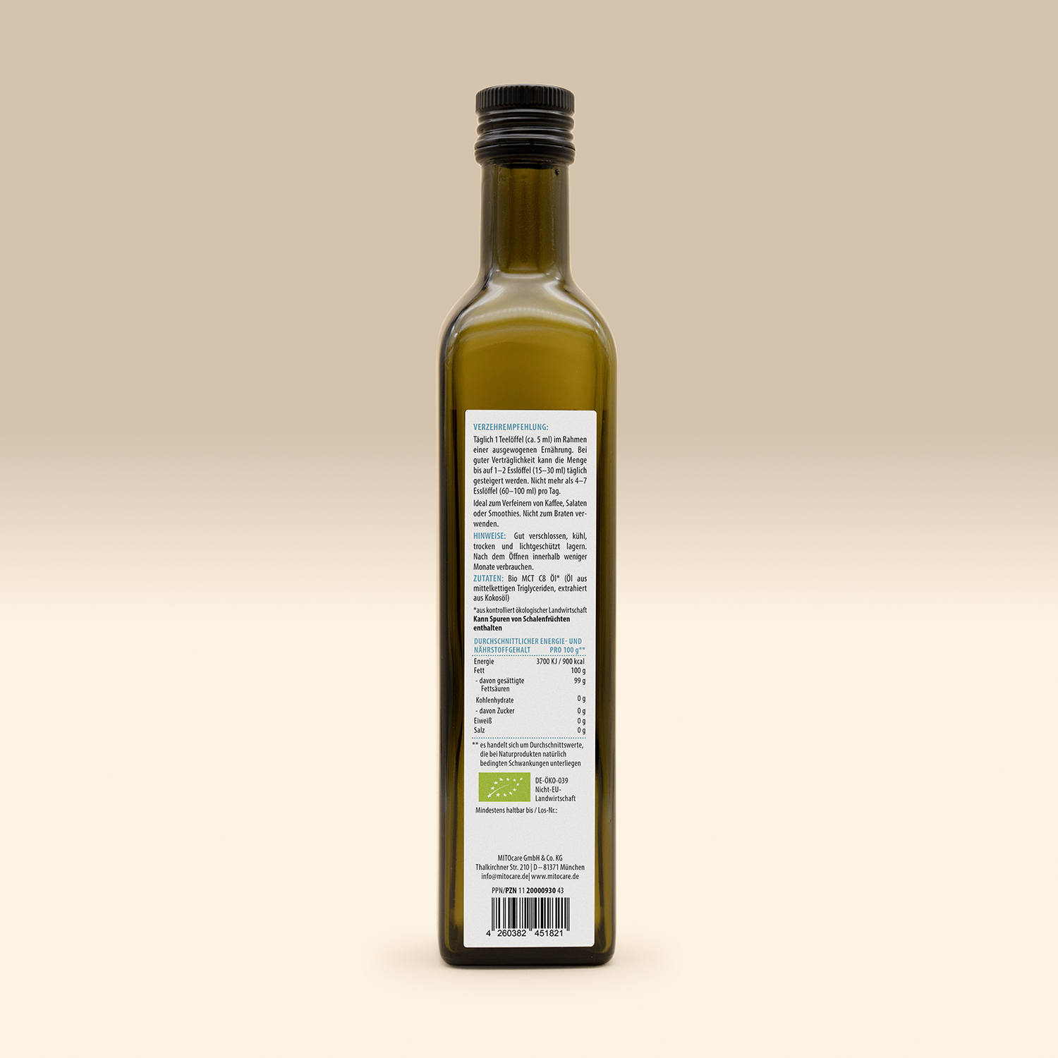 Aufgrund der Geschmacks- und Geruchsneutralität lässt sich unser Bio MCT C8 Öl hervorragend mit Kaffee oder Wasser mischen und passt ideal zu Smoothies, Säften, Shakes oder Salatdressings. Beim Erhitzen kann MCT-Öl jedoch einen scharfen oder bitteren Geschmack entwickeln, weshalb es nicht zum Braten, Frittieren oder Erhitzen verwendet werden sollte.