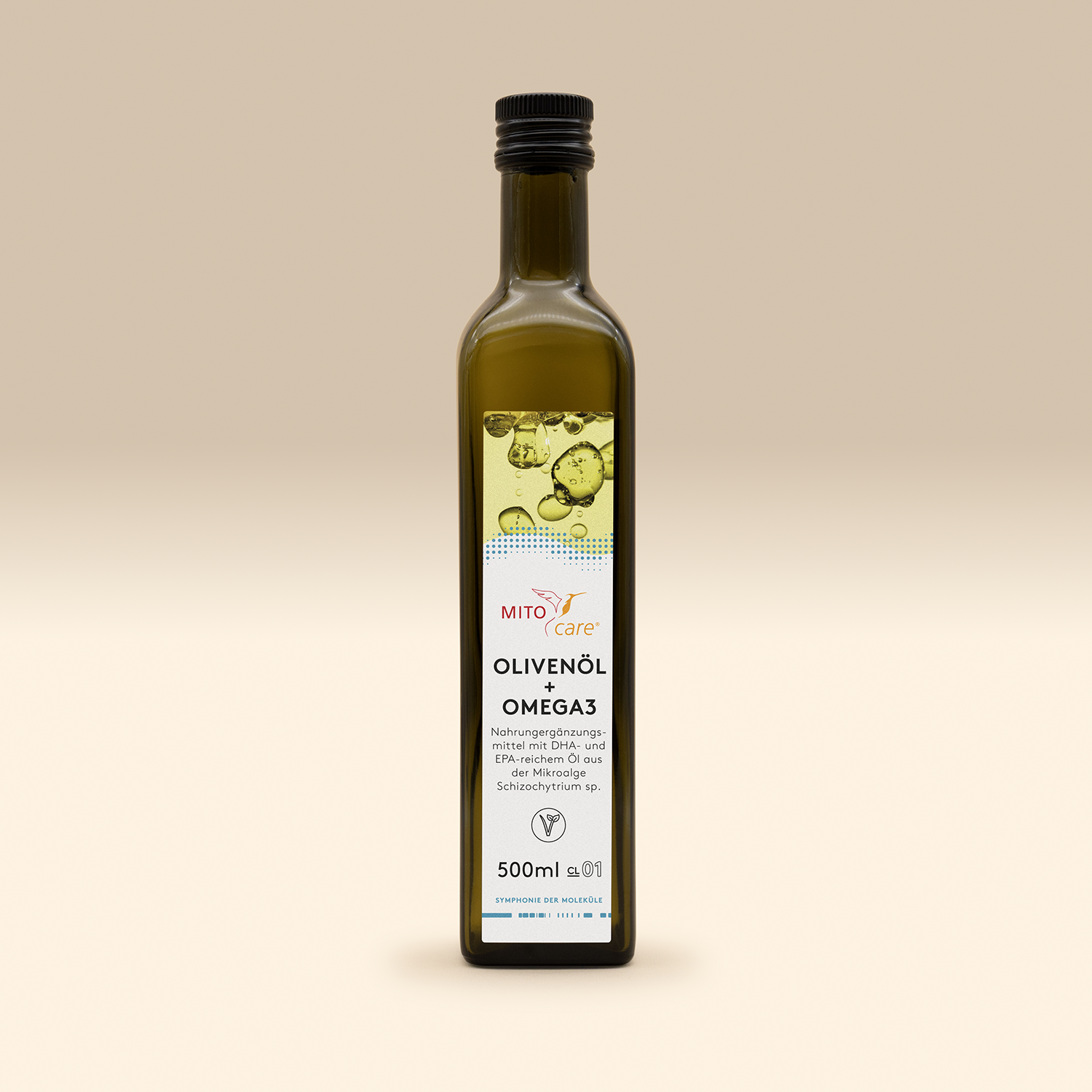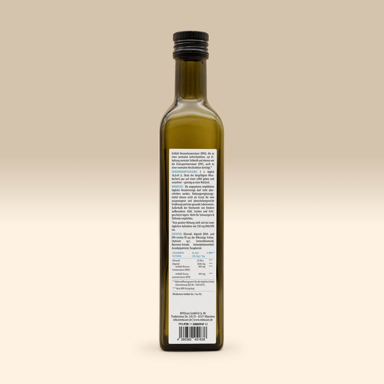 Unsere 2-in-1-Mischung aus Olivenöl + Omega 3 vereint die wichtigen Fettsäuren aus nativem Olivenöl extra mit den Omega-3-Fettsäuren DHA (Docosahexaensäure) und EPA (Eicosapentaensäure) aus pflanzlichem Algenöl. Pro Tagesdosis (33,2 ml) enthält unser Öl 900 mg DHA und 450 mg EPA und bietet daher eine pflanzliche und nachhaltige Alternative zu Fischöl.