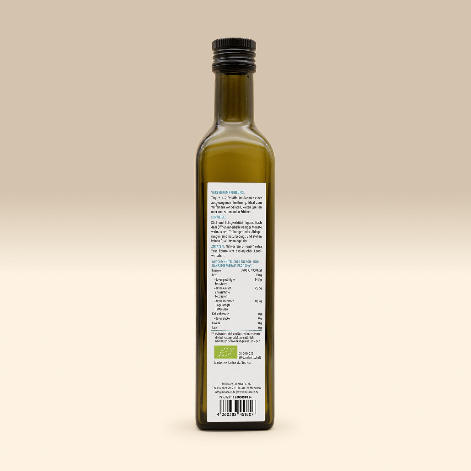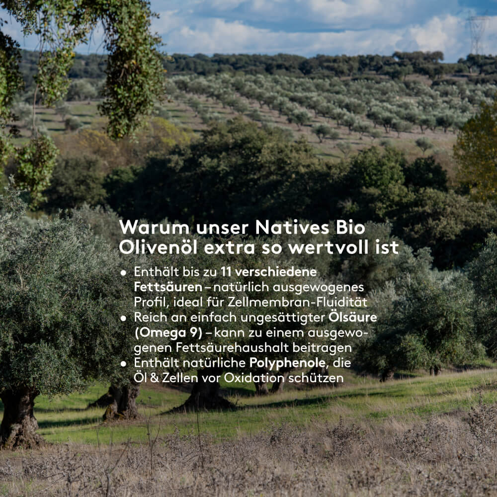 Unser natives Bio Olivenöl extra ist ein 100% reines, kaltgepresstes Olivenöl – frei von Zusätzen.