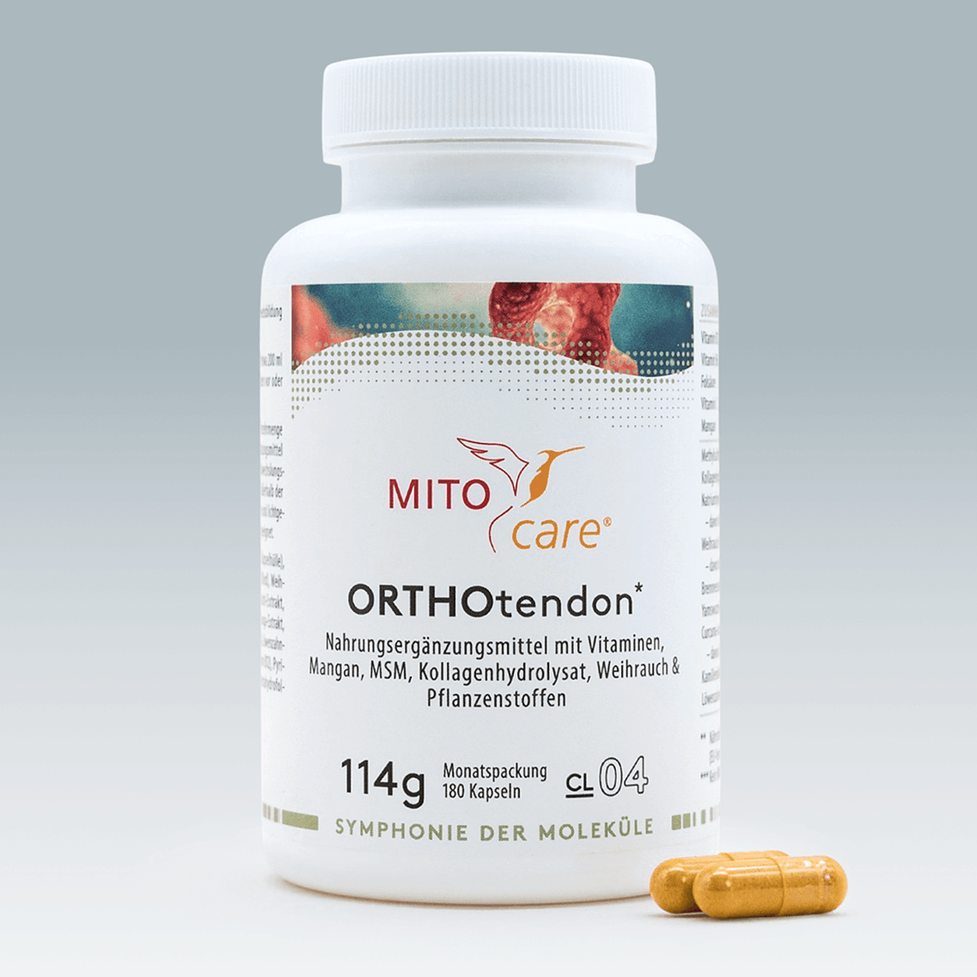 Además de la destacada proporción de colágeno, el producto ORTHOtendon contiene las formas bioactivas de las vitaminas B12, B6 y ácido fólico, que juntas promueven no solo el sistema inmunológico 5 sino también funciones mentales como el impulso y la motivación 6 , así como la formación de glóbulos rojos 7 , que son responsables del suministro de oxígeno a todas las células del cuerpo. El oligoelemento manganeso contribuye a la formación saludable del tejido conectivo 1 . El tejido conectivo incluye estructuras corporales como tendones, ligamentos, cartílagos, huesos y piel. El ácido fólico bioactivo también juega un papel en la síntesis del aminoácido 3 , base para la síntesis de proteínas y la formación de colágeno. El producto ORTHOtendon también contiene los componentes MITOcare BIC*, un yogur en polvo especial obtenido a través de la fermentación de la leche con 11 cepas diferentes de lactobacterias y bifidobacterias, así como un valioso complejo vegetal de cúrcuma, incienso, ortiga, escaramujo, flores de manzanilla, diente de león, raíz de ñame y otros.